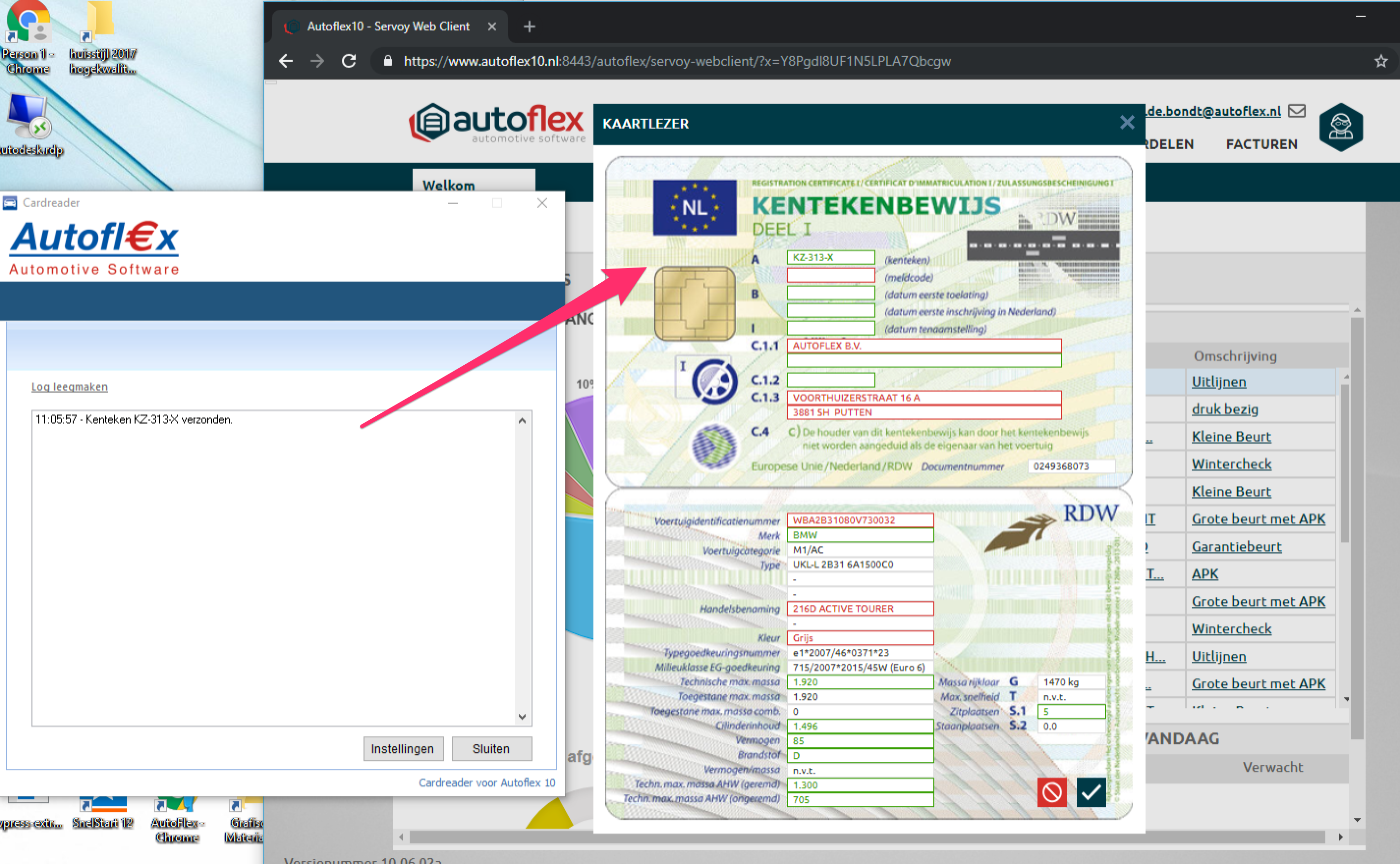 C: De Cardreader tool zal aangeven dat het kentekenbewijs met het kenteken XX-YY-ZZ verzonden is (naar Autoflex10) |