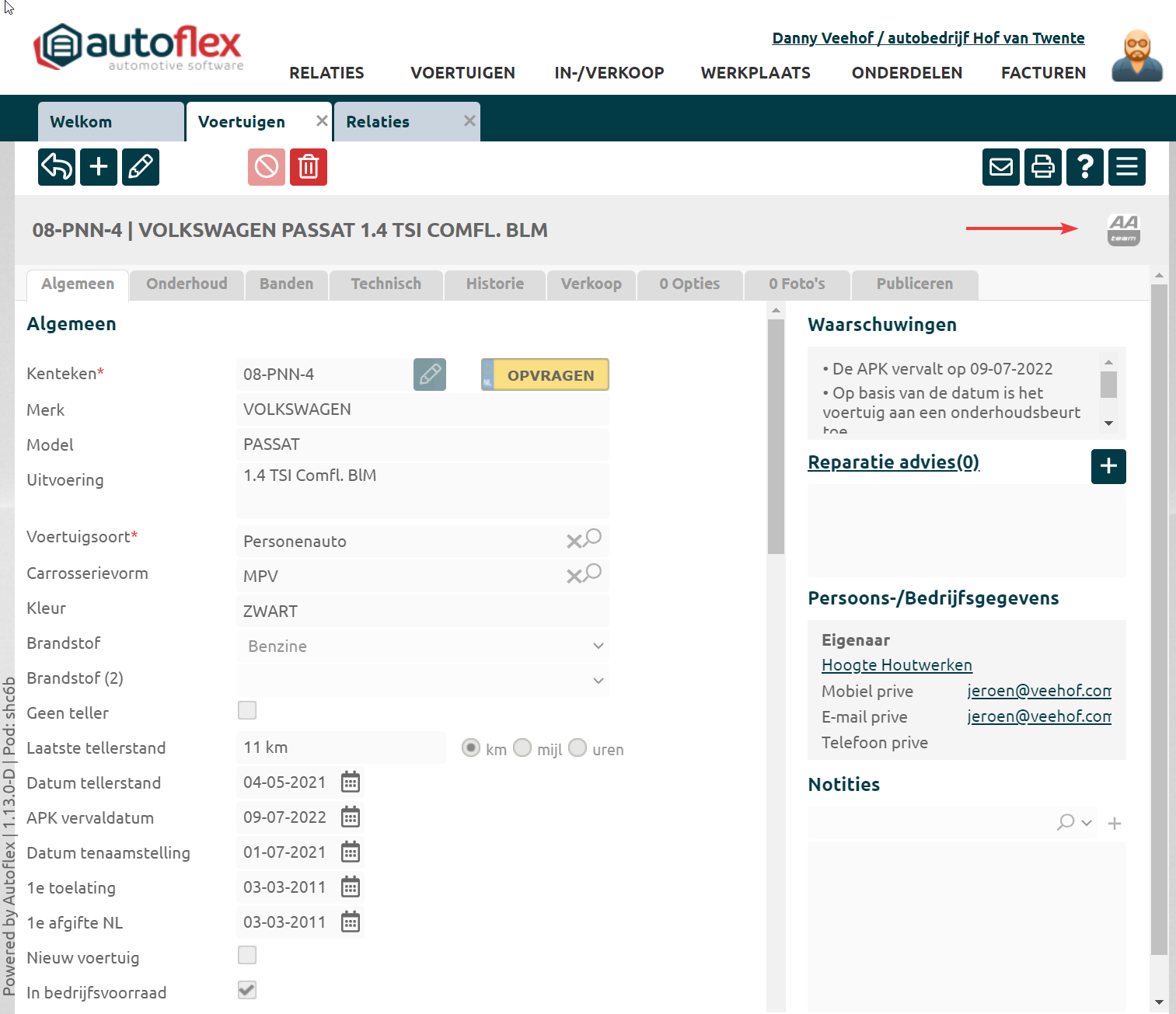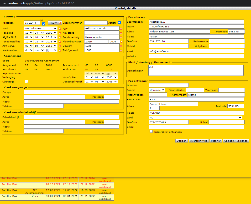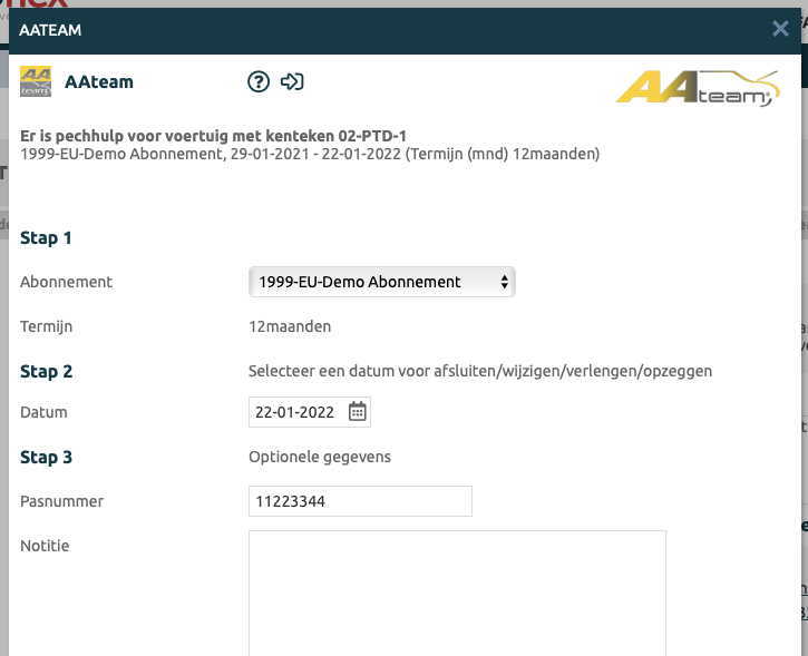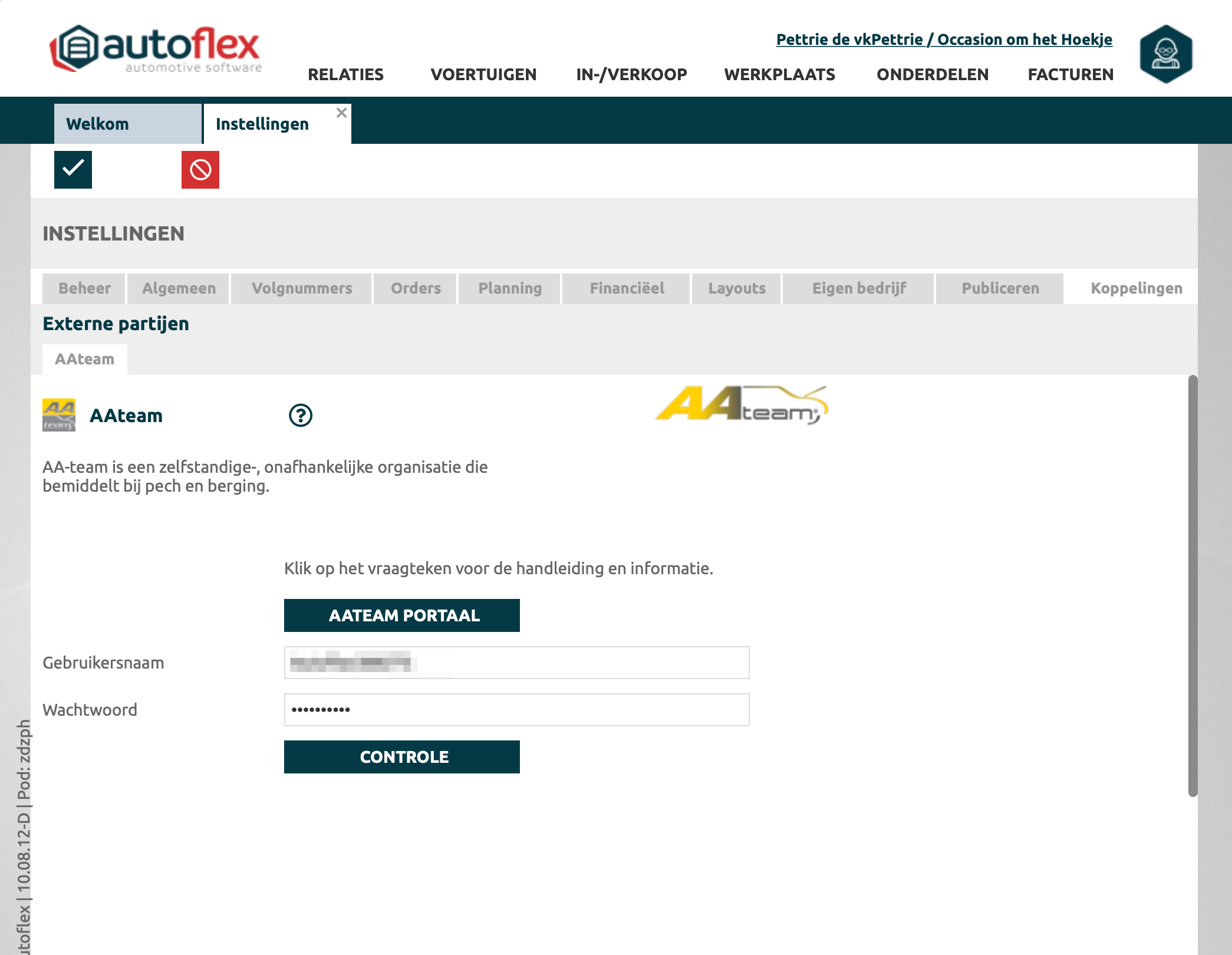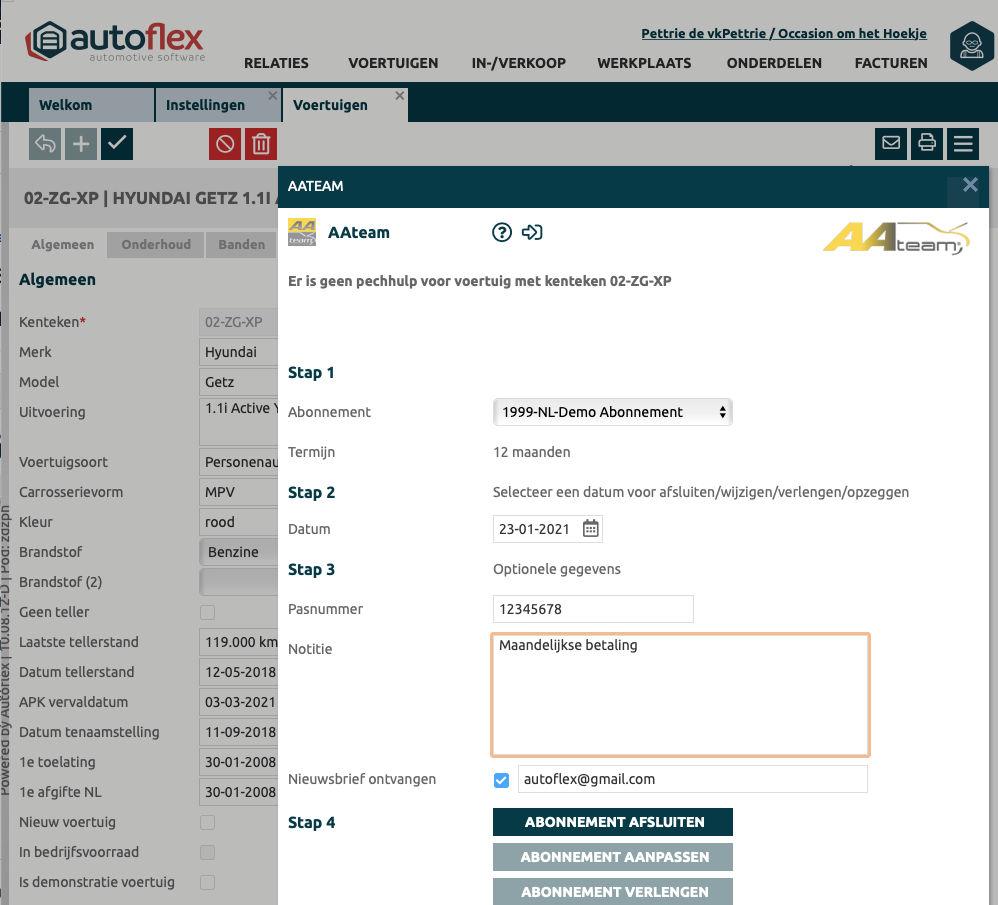 Deze koppeling geeft je de mogelijkheid direct vanuit Autoflex een abonnement af te sluiten, hierbij worden de gegevens van de relatie en het voertuig automatisch door gegeven naar AA-Team. Daarnaast kun je snel de bestaande abonnementen bekijken direct vanuit Autoflex.