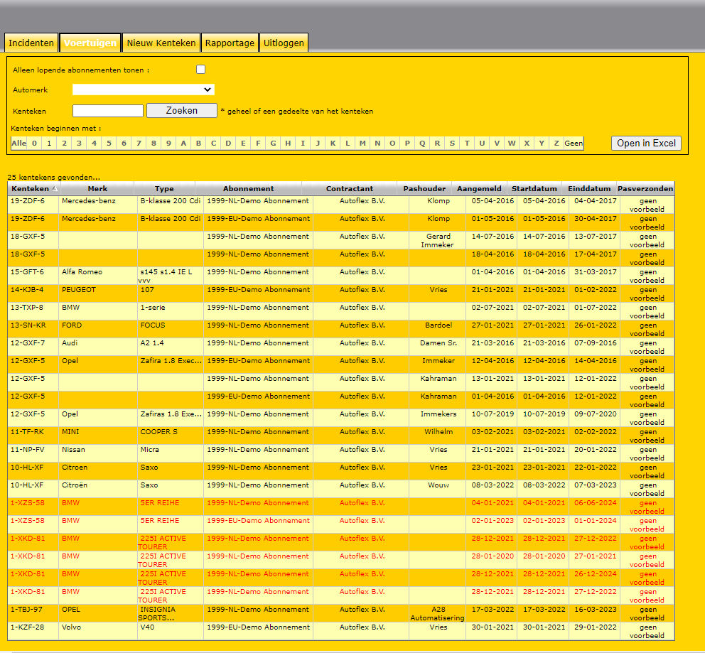 Bij het overzicht van voertuigen kunnen de voertuigen worden gefilterd waarvoor een pechhulp abonnement is afgesloten bij AA-Team.