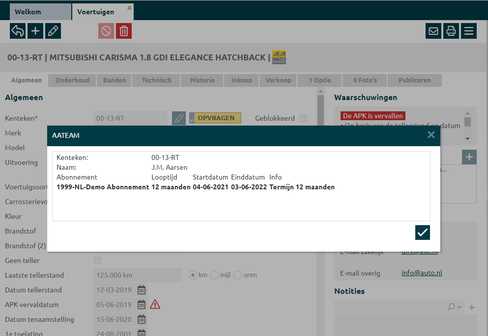 Bij de stamgegevens van het voertuig is nu een icoon zichtbaar, door hier op te klikken wordt een dialoog getoond met de abonnement informatie.