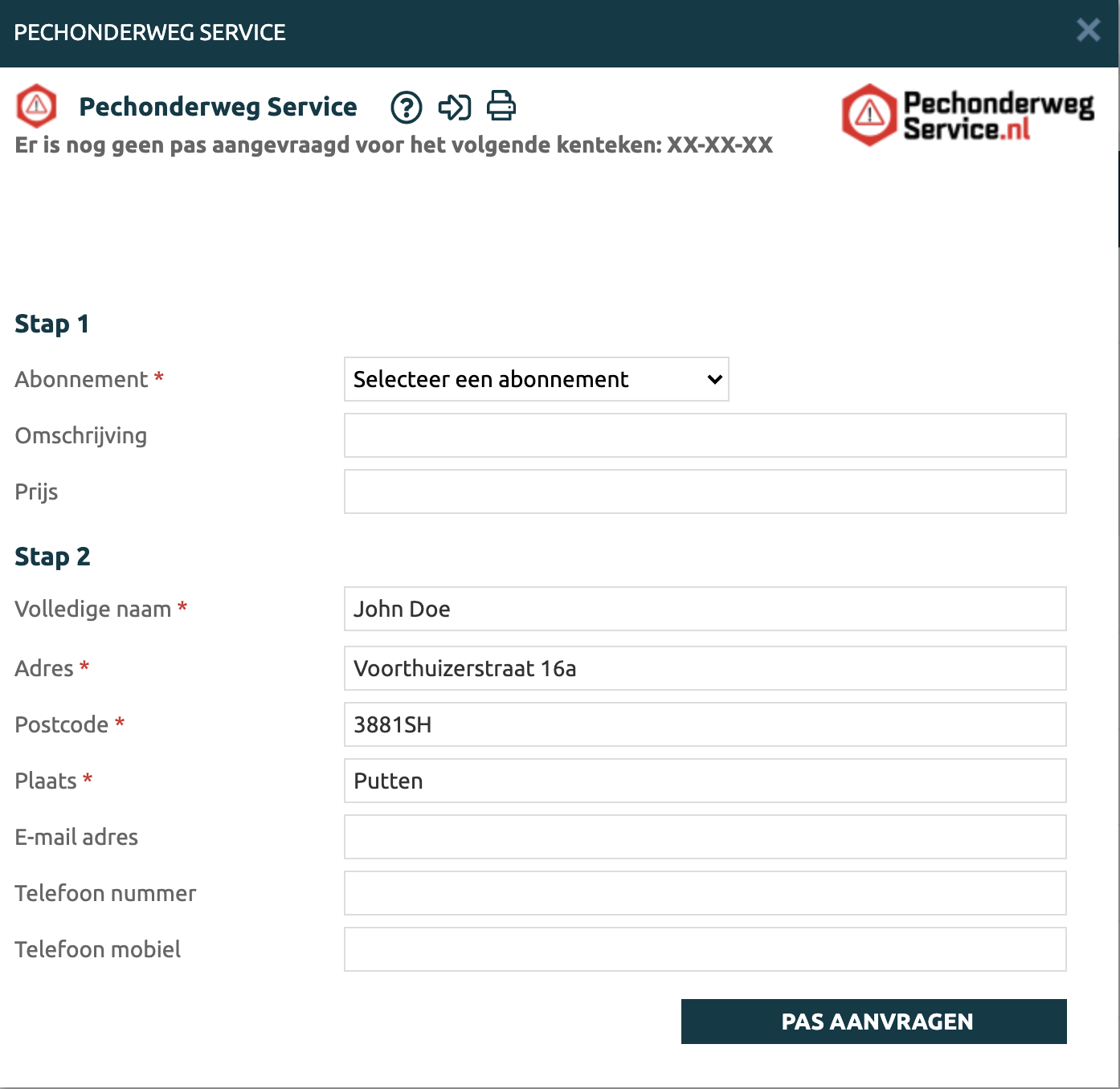 De abonnement gegevens worden nu direct naar Pechonderweg Service gestuurd, onder de header is nu het aangevraagde abonnement zichtbaar