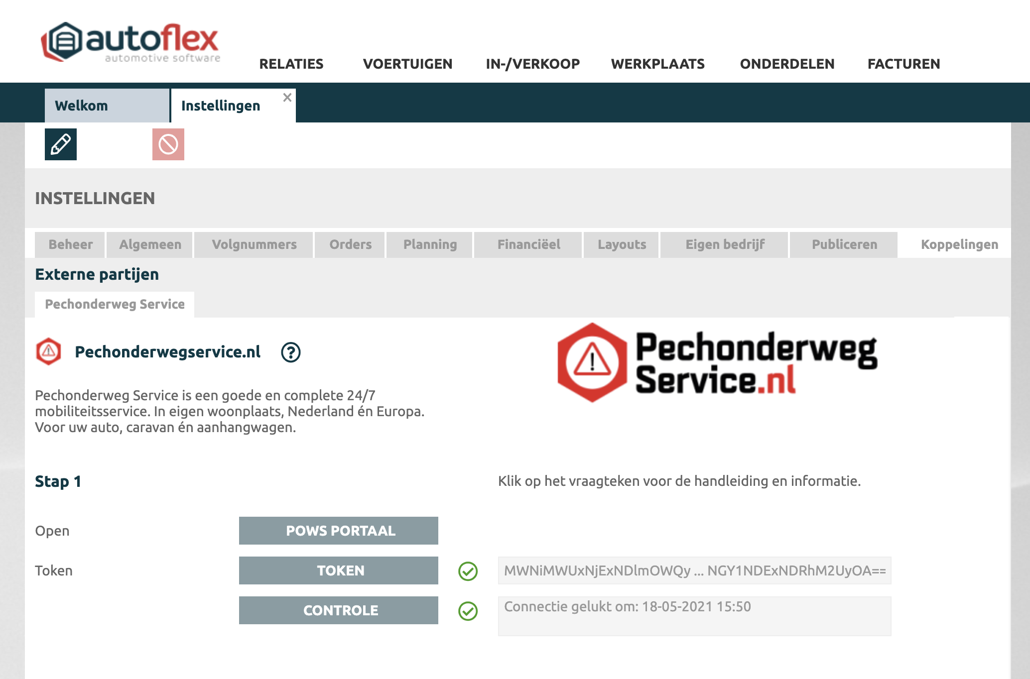 Ga naar de instellingen via: Instellingen → Koppelingen → Pechonderweg Service |