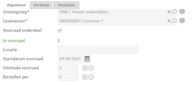 | In het detail van het onderdeel zie je de actuele voorraad van het onderdeel. Door de velden "Minimale voorraad" en "Bestellen per" in te vullen, zal er voor dit onderdeel ook een besteladvies worden gegenereerd. Op het tabblad mutaties zie je waar en wanneer het onderdeel gemuteerd is. |