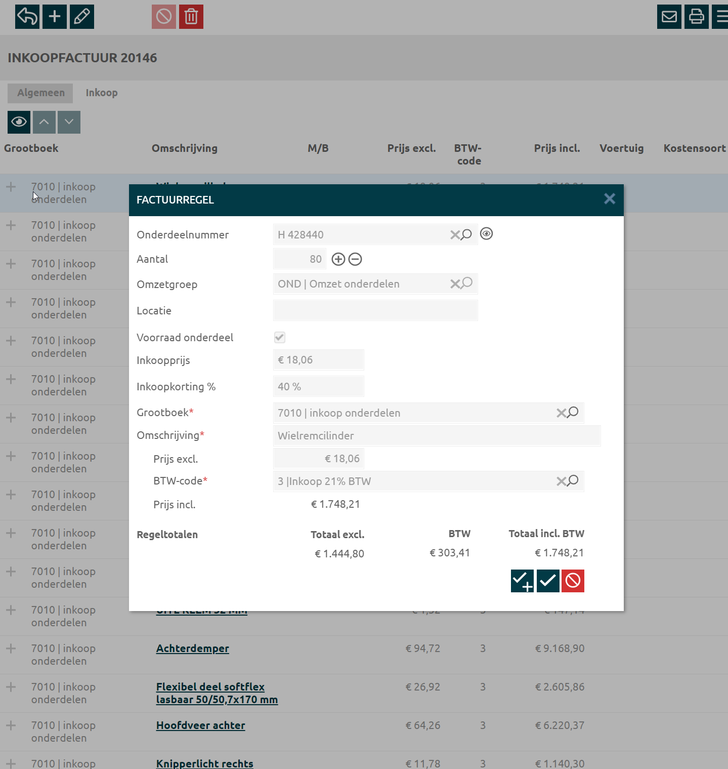 | Inkoopfacturen van je grossier voer je in via onderdelen → inkoopfacturen. Het aantal dat je invoert, verhoogt de voorraad van het onderdeel. |