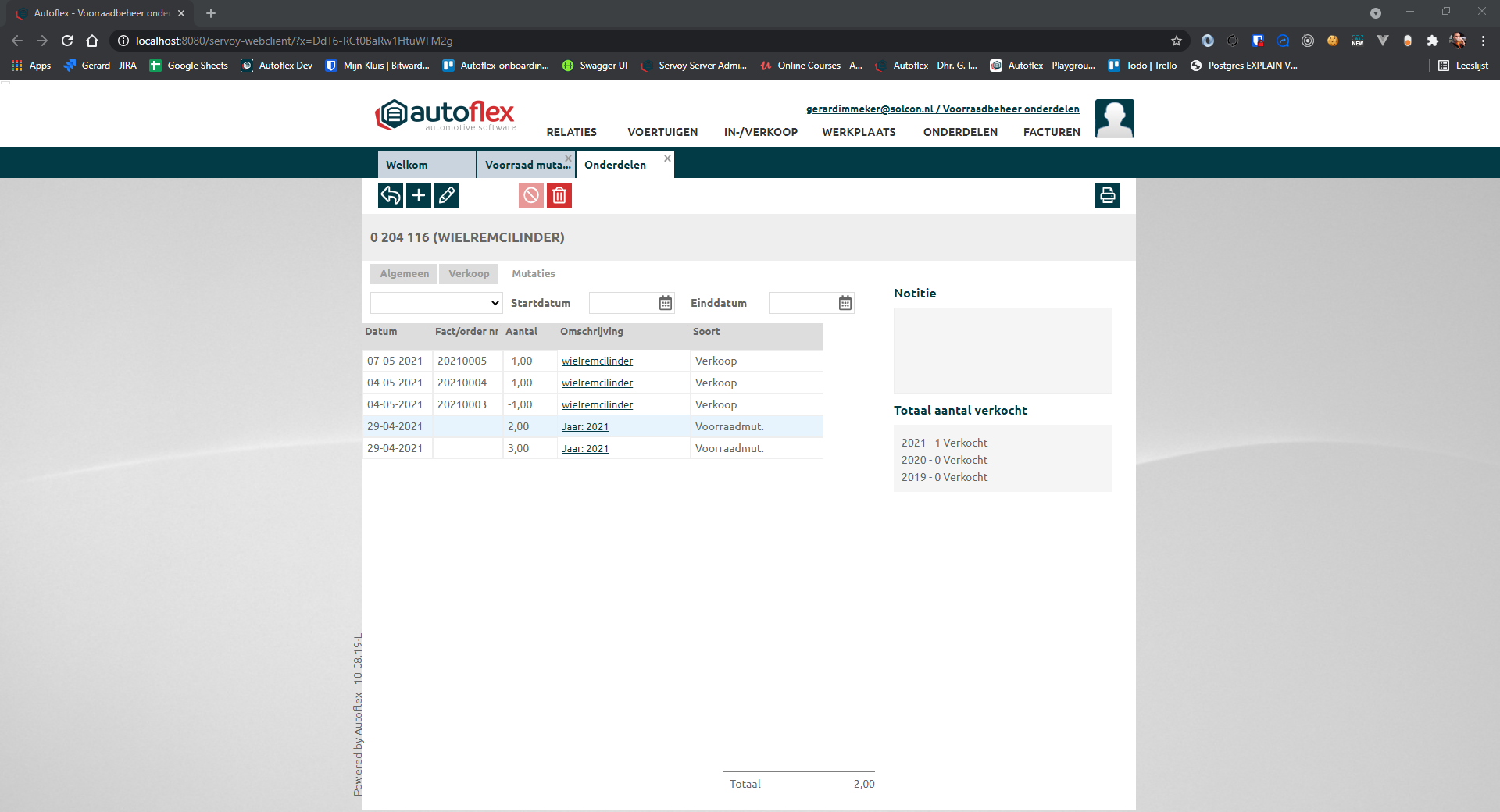 Je vindt bij het tabblad mutaties de mutaties die zijn gedaan om de huidige voorraad van het onderdeel te bepalen.