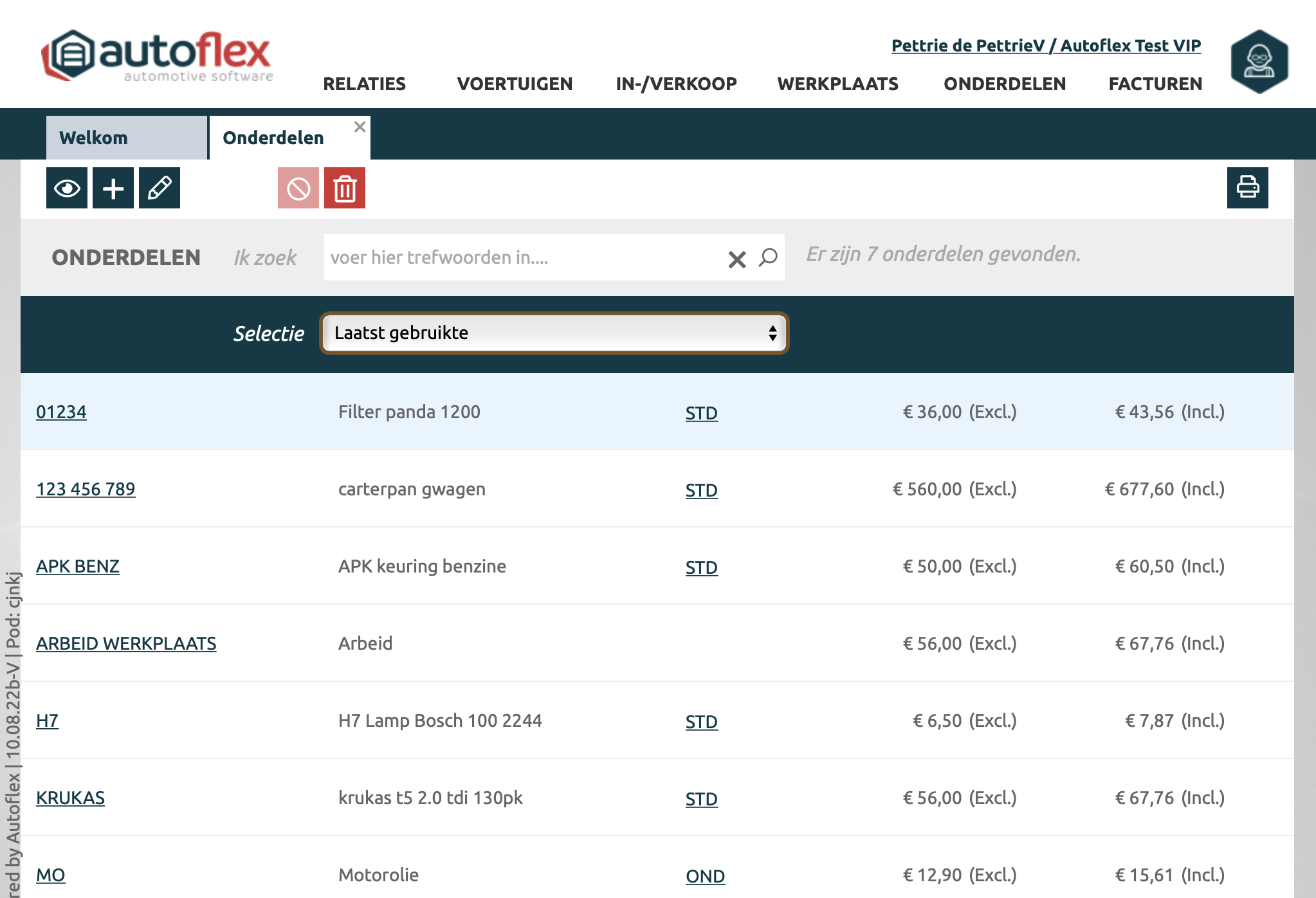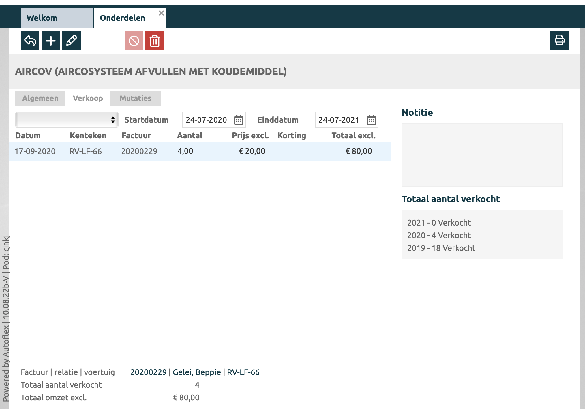 Detail overzicht van de verkochte onderdelen Filteren kan op:  Datum: startdatum tot en met einddatum  |