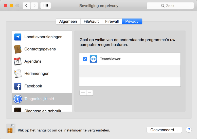 Ga via het Apple-menu naar Systeemvoorkeuren. Klik hier op "Security & Privacy" of "Beveiliging en privacy". Klik onder "Privacy" op het item "Accessibility" of "Toegankelijkheid". Mogelijk moet u eerst nog op het hangslotje klikken en uw gebruikersnaam en wachtwoord ingeven om het venster te kunnen ontgrendelen. Geef vervolgens toegang aan TeamViewer door deze aan te vinken. |
