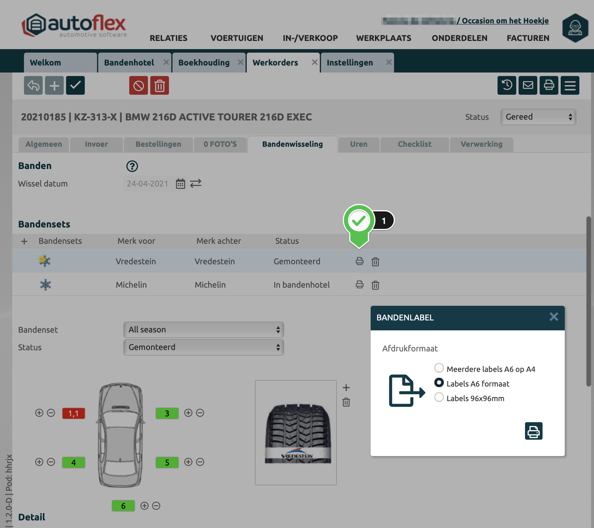 Vanuit de werkorder is het mogelijk om van de in het overzicht geselecteerde bandenset labels te printen.