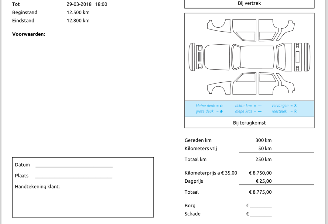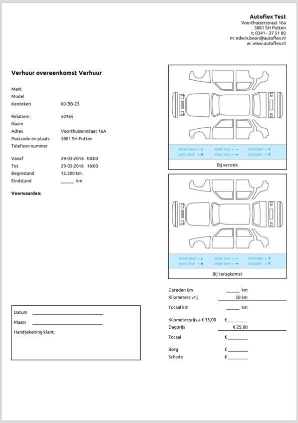 Verhuur overeenkomst is toegevoegd als print optie in het print menu bij de werkorder. Alle benodigde informatie uit de werkorder wordt ingevuld in de verhuur overeenkomst.