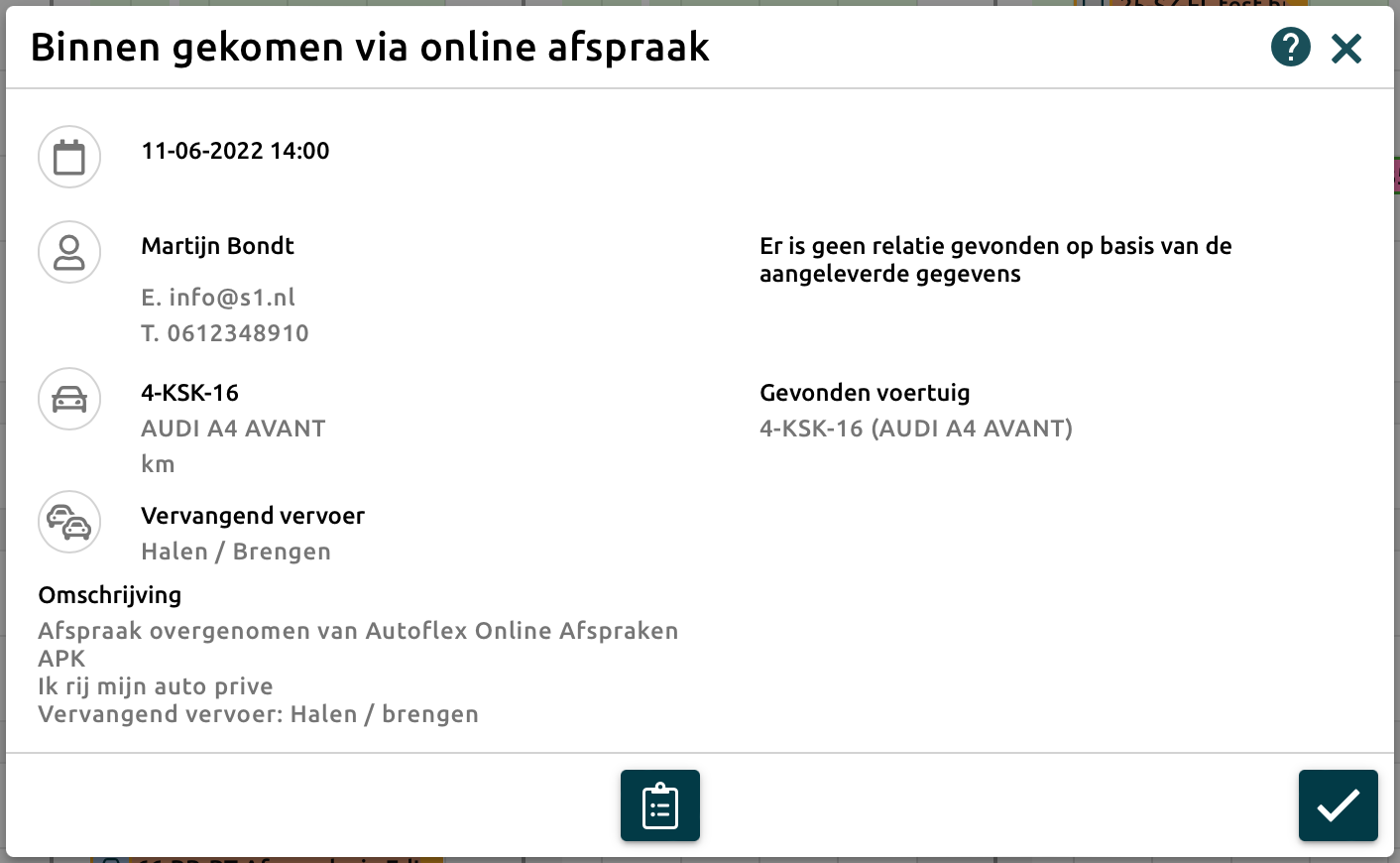 | De originele gegevens van de afspraak zijn via het kalender icoon terug te zien bij de werkorder die aangemaakt is vanuit een Online afspraak |