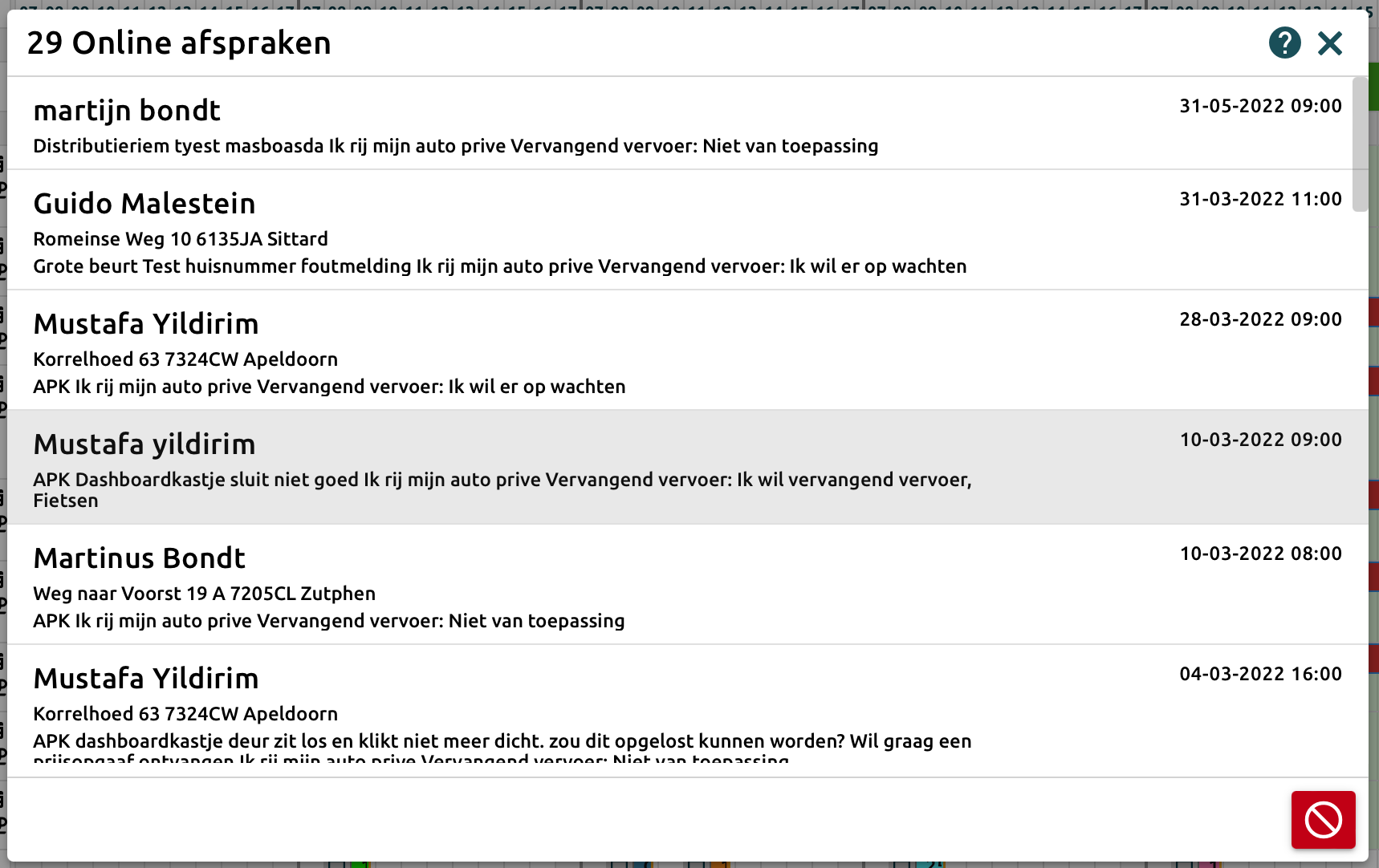 Deze afspraken kunnen vanuit de module Online afspraken komen, zie: Online afspraken . Of ze komen vanuit een partner partij die de online afspraken toevoegt aan de planning, zie ook: Autosociaal/EdLink gebruiken