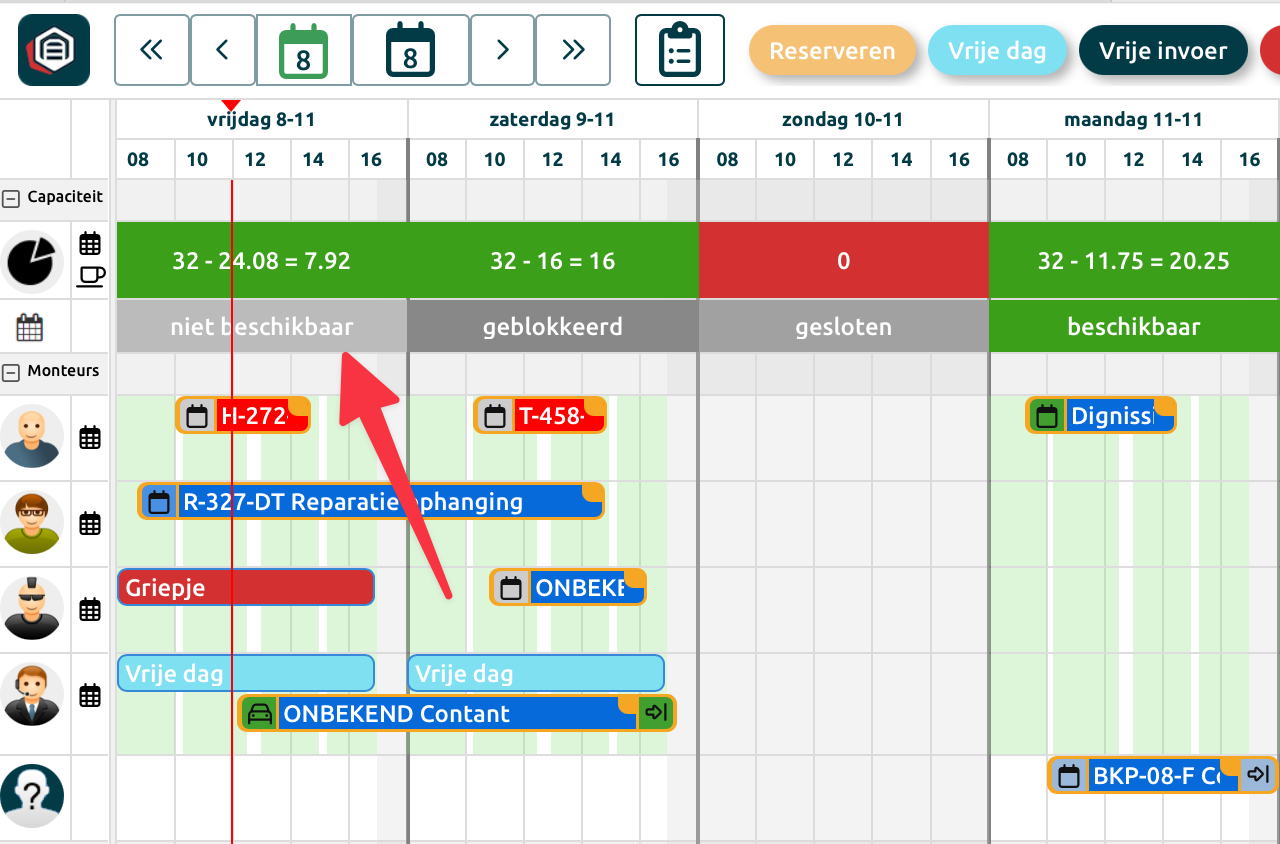 De capaciteit is de beschikbaarheid van monteurs ten opzichte van de tijd per dag. Dus hoeveel ruimte is er nog in de planning om nieuwe opdrachten, werkorders in te plannen op de ze dag.