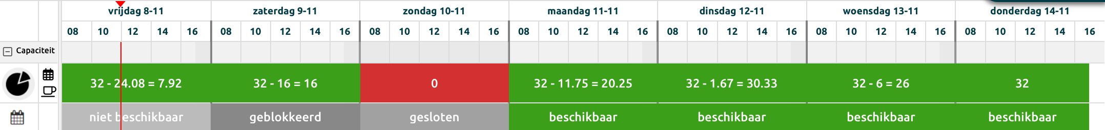 De capaciteit wordt in kleuren: groen, oranje, rood, en grijs weergegeven ook wordt in de balk het aantal beschikbare uren en en uren die over zijn op deze dag aangegeven.