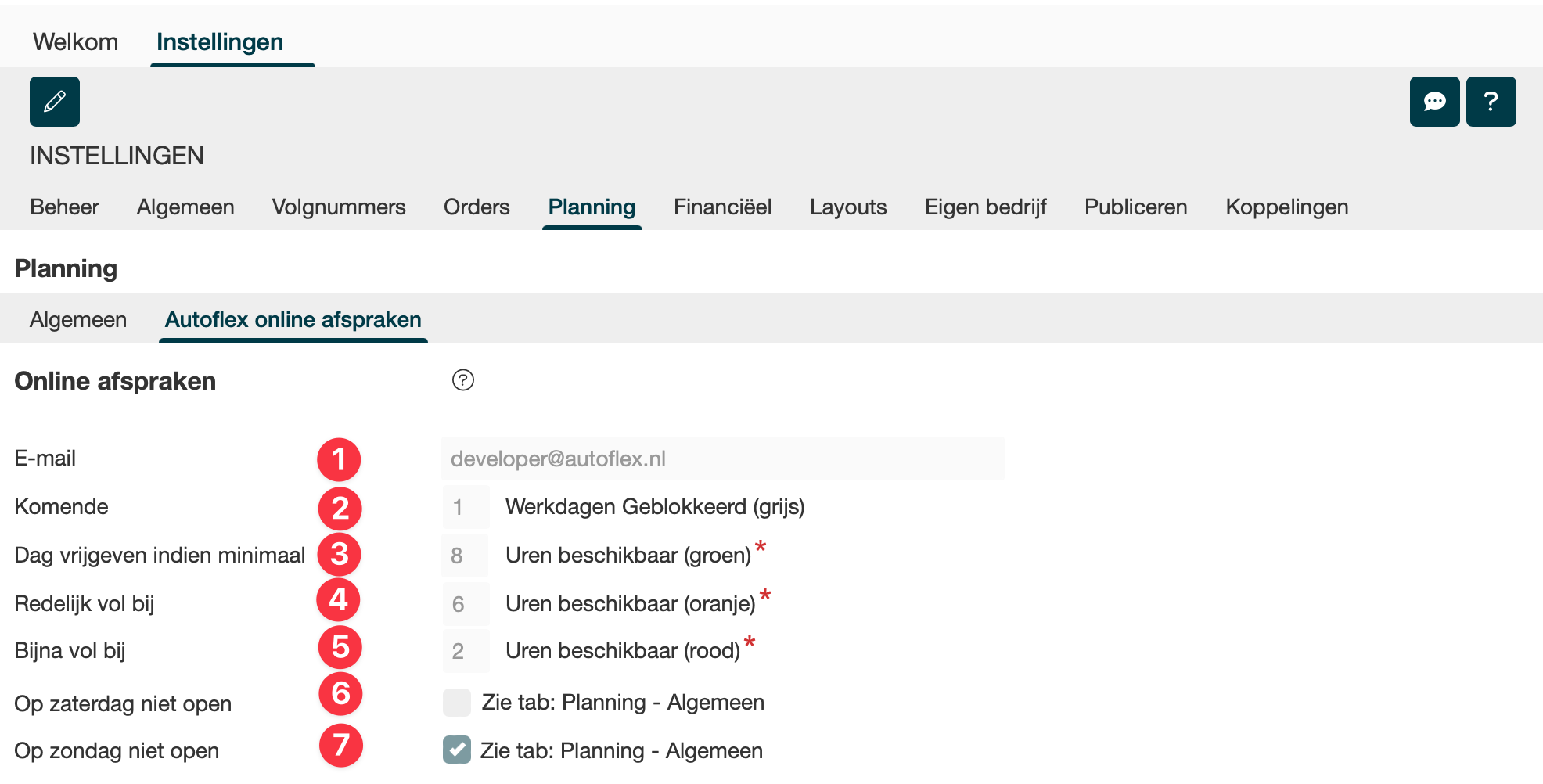 4. Gearceerd, of deze dag geblokkeerd is. Dit wordt ook doorgegeven aan de Autoflex Online afspraken of andere externe Online afspraken tools