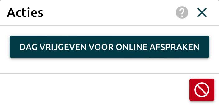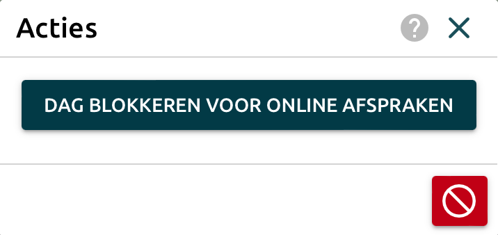 Om een dag te blokkeren klok op het capaciteitsblok van deze dag, in het dialoog kies nu: Dag blokkeren voor online afspraken. Deze dag is nu geblokkeerd voor de Online Afspraken.