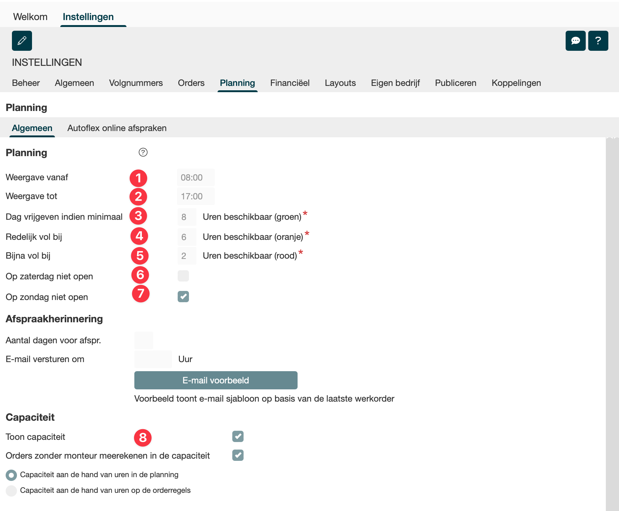 1. In kleuren wat de beschikbaarheid is. Dit wordt ook doorgegeven aan de Autoflex Online Afspraken of andere externe Online afspraken tools