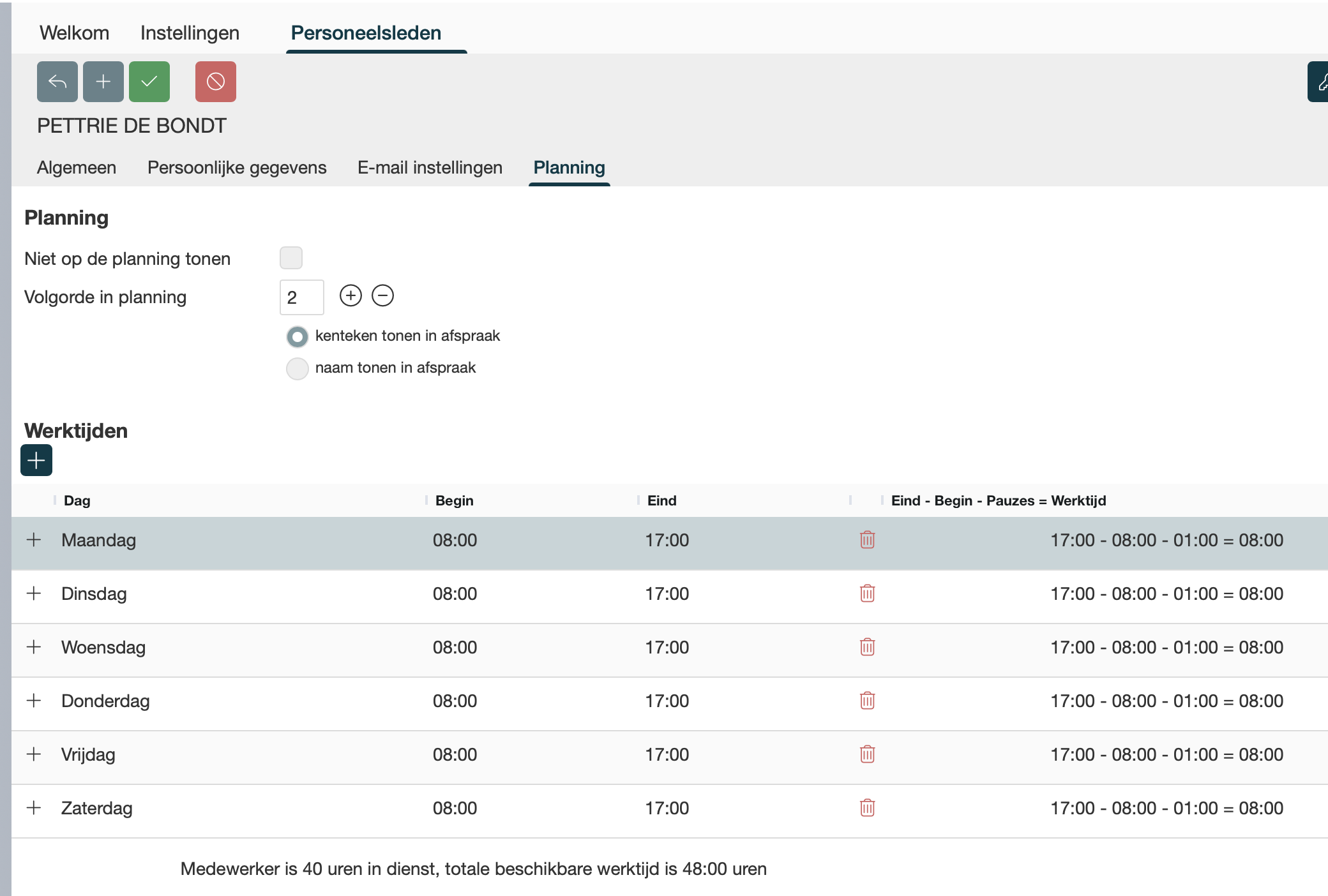 Deze instellingen kunnen via Instellingen → Personeelsleden → tabblad Planning worden gewijzigd.