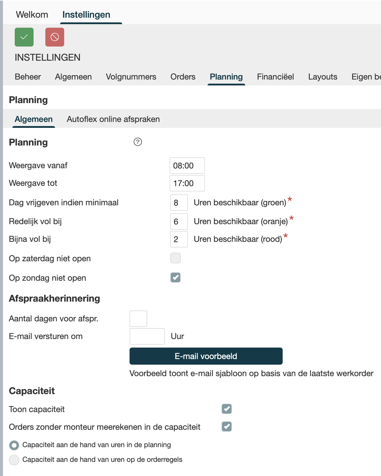 • De manier van capaciteit berekenen: aan de hand van uren in de planning zelf of aan de hand van de aantal ingevoerde uren op tab invoer van de werkorder