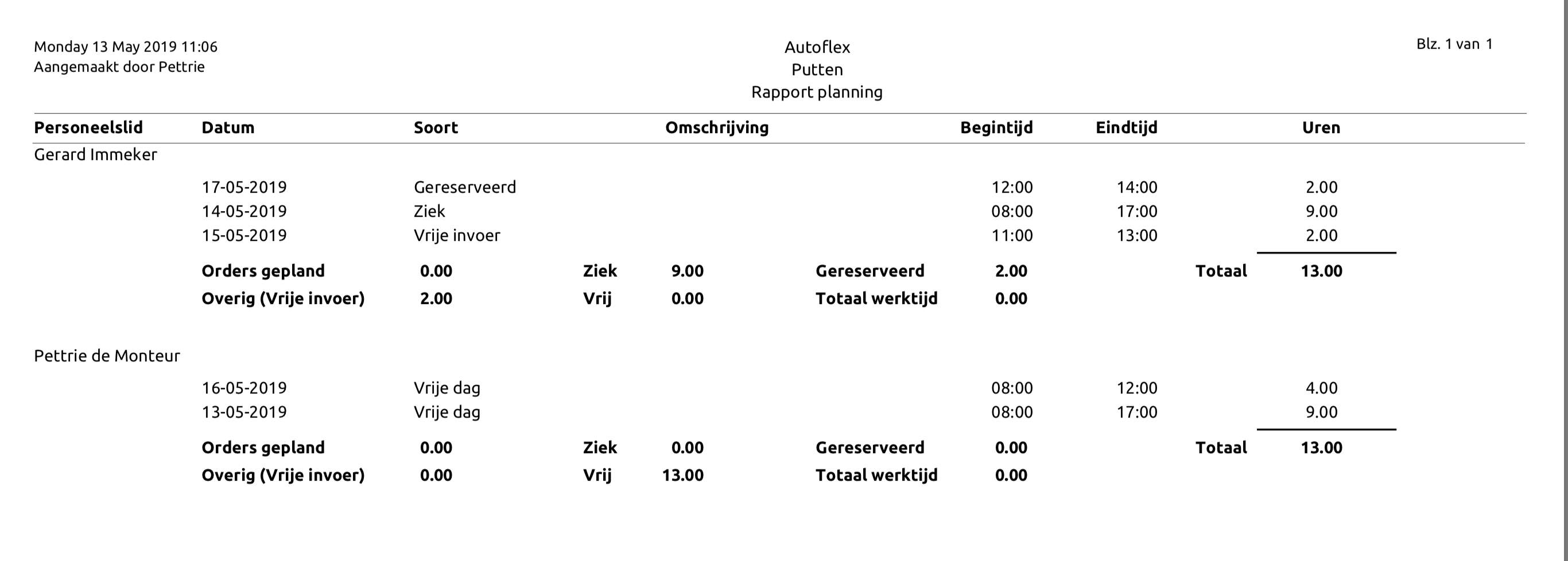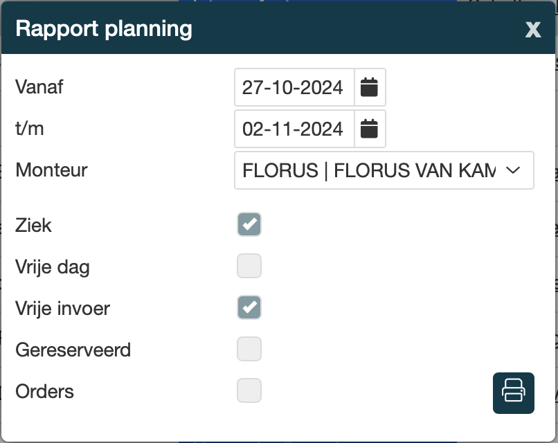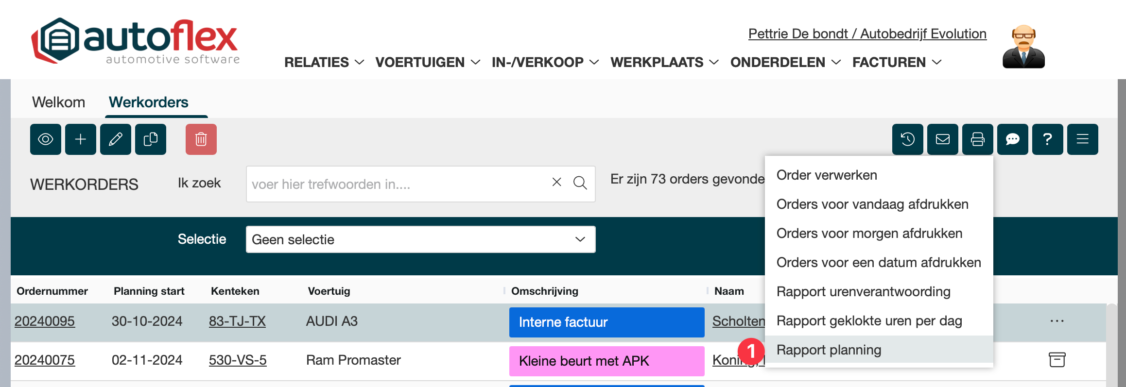 • Werkplaats → Werkorders → printer icoon rechts boven in → Rapport Planning