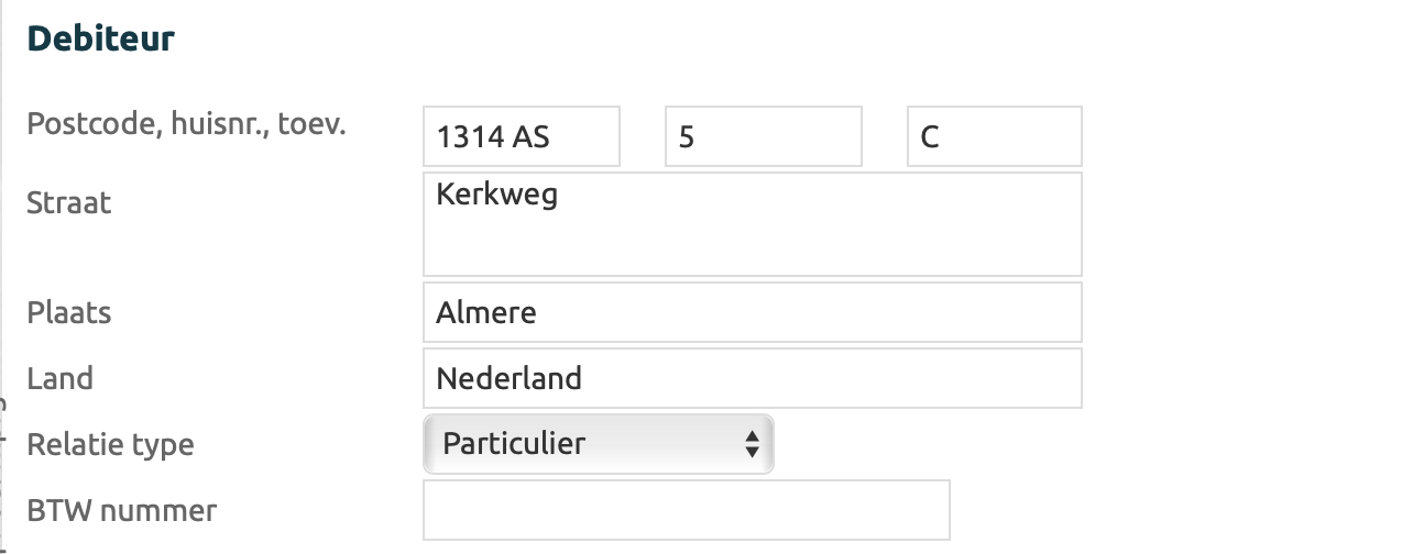 DebiteurIn de sectie debiteur worden alle gegevens van de gekoppelde debiteur getoond, als er een debiteur gekozen in de wizard of bovenaan in de order. De gegevens kunnen hier ook aangepast worden, alle aanpassingen worden direct doorgevoerd in de gekoppelde debiteur/relatie. Als gekozen is voor Passant dan kunnen hier de gegevens van de passant worden ingevuld | |
