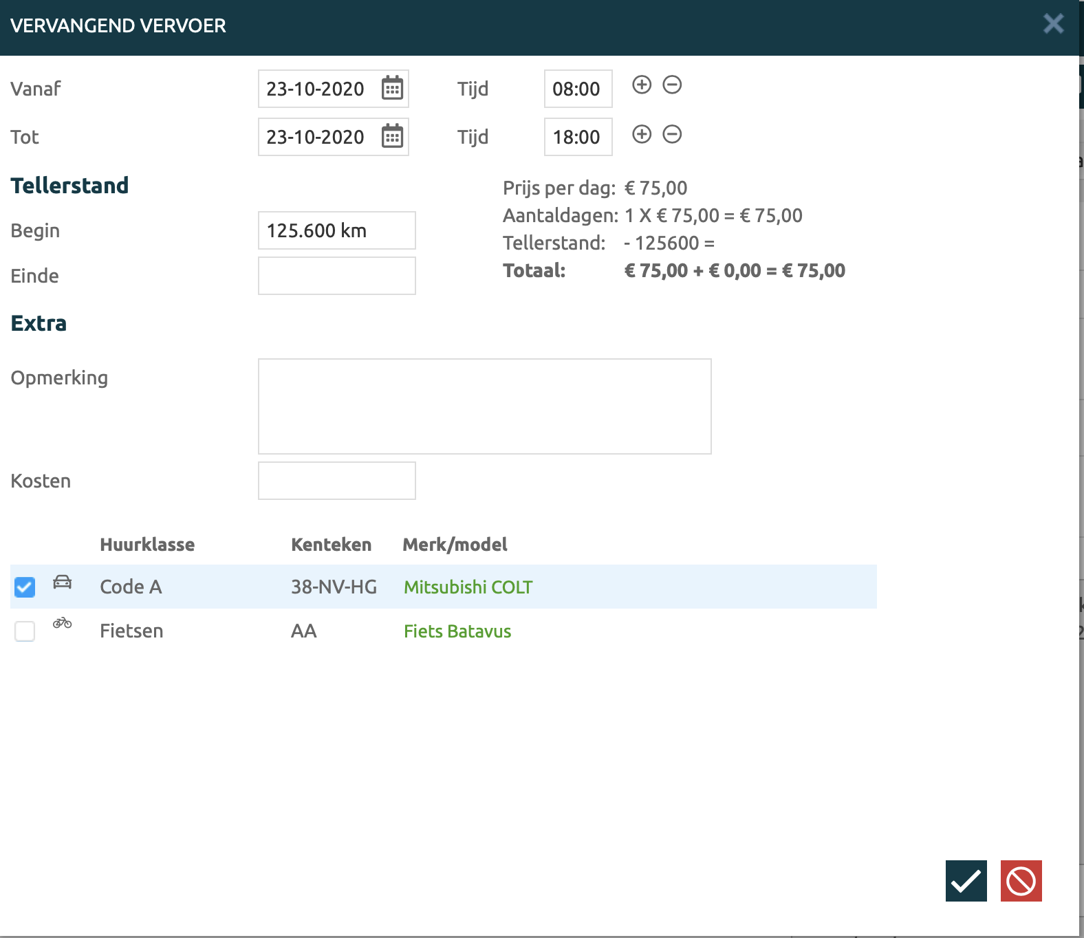 Vervangend vervoerKeuze maken uit auto's die ingesteld zijn als huur/en leen auto's, kan hier auto's en fietsen toevoegen.