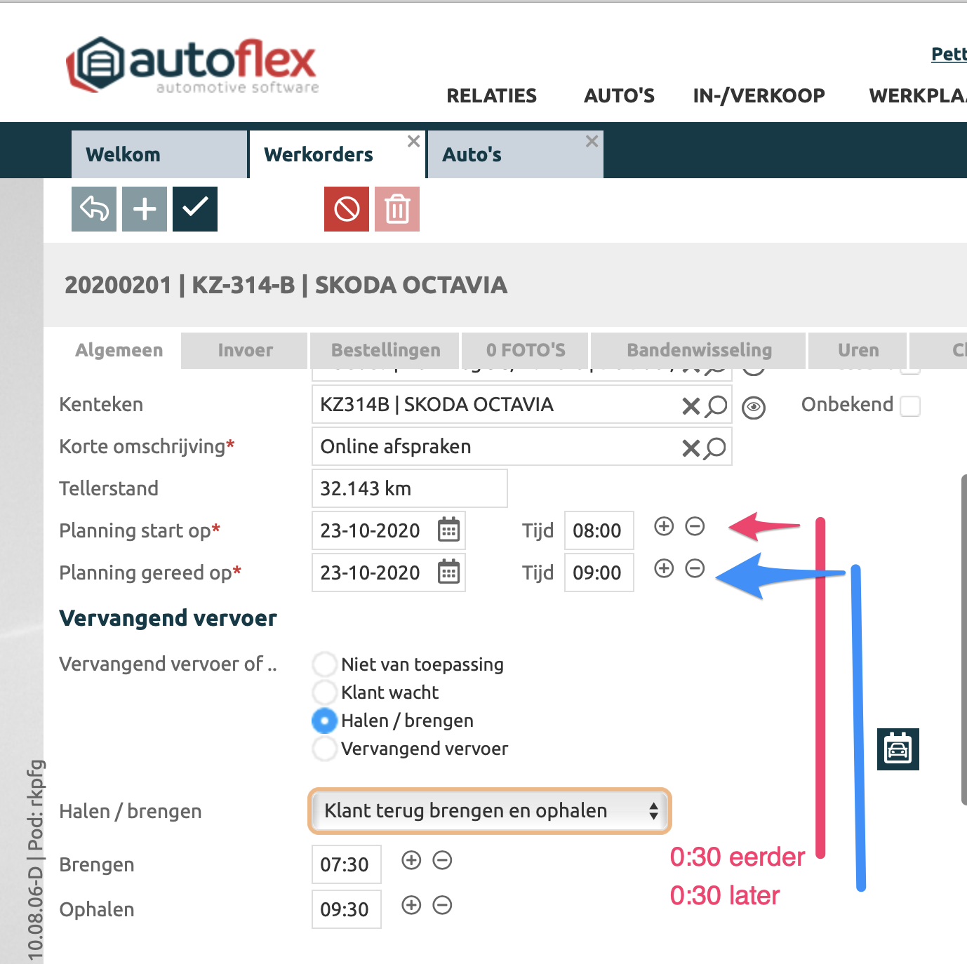 Halen/brengenStarttijd altijd 0:30 minuten eerder Eindtijd altijd 0:30 minuten later De tijden zijn zo ingesteld om er voor om te zorgen dat klant er op tijd is, en bij ophalen dat je zelf nog even tijd hebt om alles af te ronden. | |
