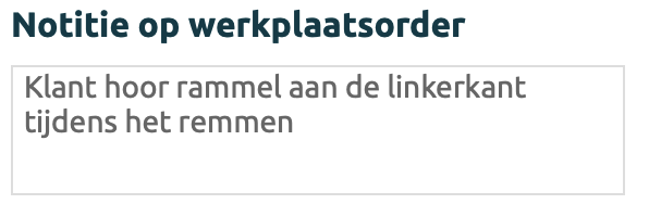 Notitie op werkorderNotitie die getoond word op de werkorder voor de monteur, dit kunnen werkinstructies zijn of specifieke aanwijzingen van de klant over het uit te voeren onderhoud Klik in het veld Notitie om de details te bekijken of om deze aan te passen | |