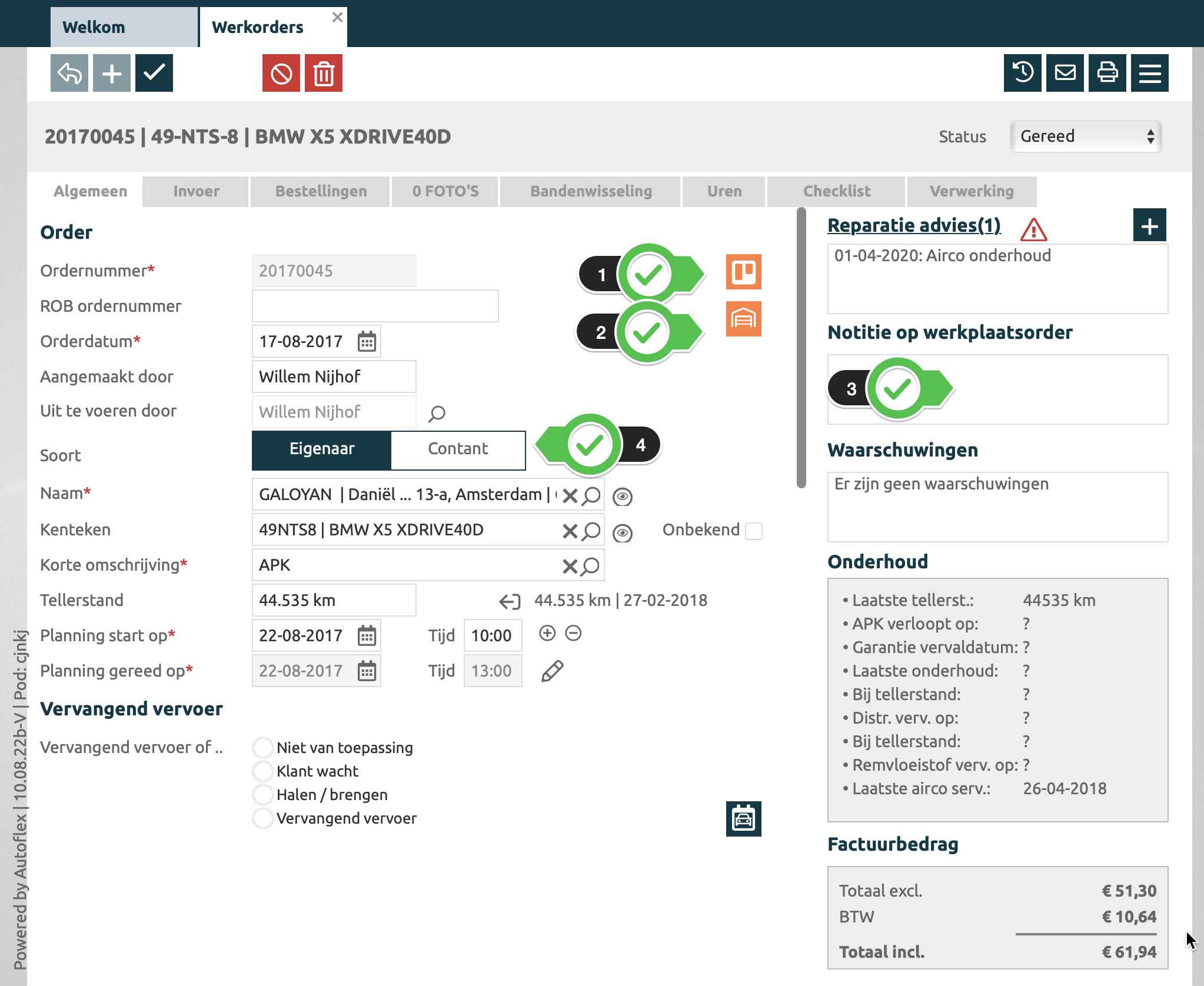 Op het eerste tabblad van de werkorder zie je de o.a. de klant- en autogegevens.