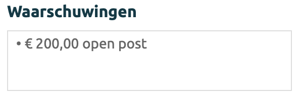 WaarschuwingAls er een relatie/debiteur aan deze werkorder is gekoppeld dan toon de waarschuwing informatie over de klant die belangrijk zijn, zoals openstaande posten (dit is afhankelijk van de financiële instellingen en koppeling met een boekhoudpakket). | |