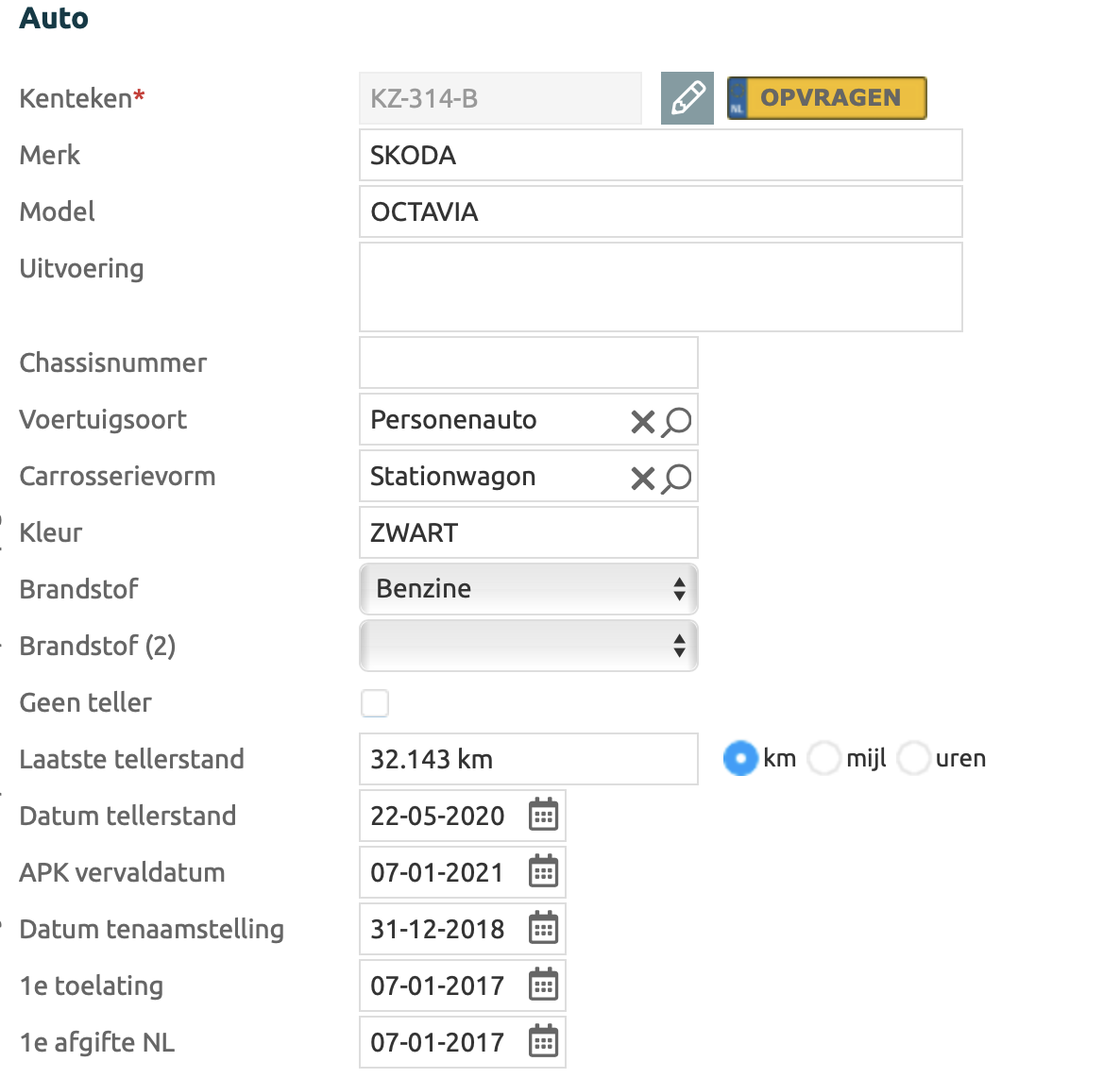 AutoIn de sectie contact mogelijkheden worden alle gegevens van de gekoppelde auto getoond, als er een debiteur gekozen in de wizard of bovenaan in de order. De gegevens kunnen hier ook aangepast worden, alle aanpassingen worden direct doorgevoerd in de gekoppelde auto Als gekozen is voor Onbekend dan kunnen hier de gegevens van de onbekende auto worden ingevuld. |