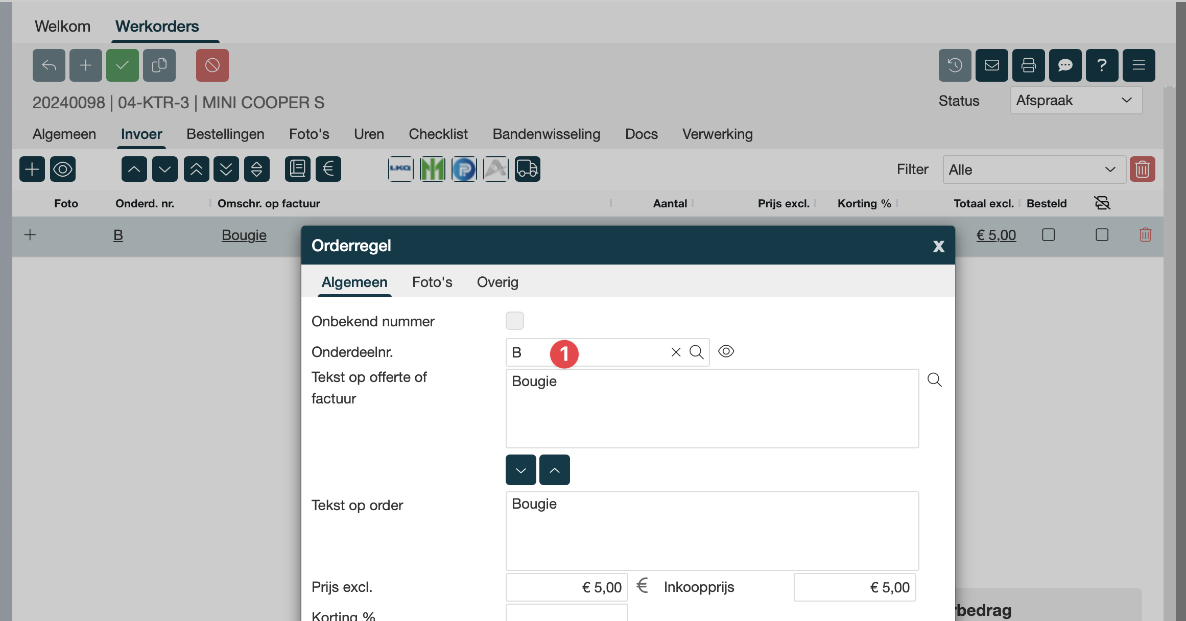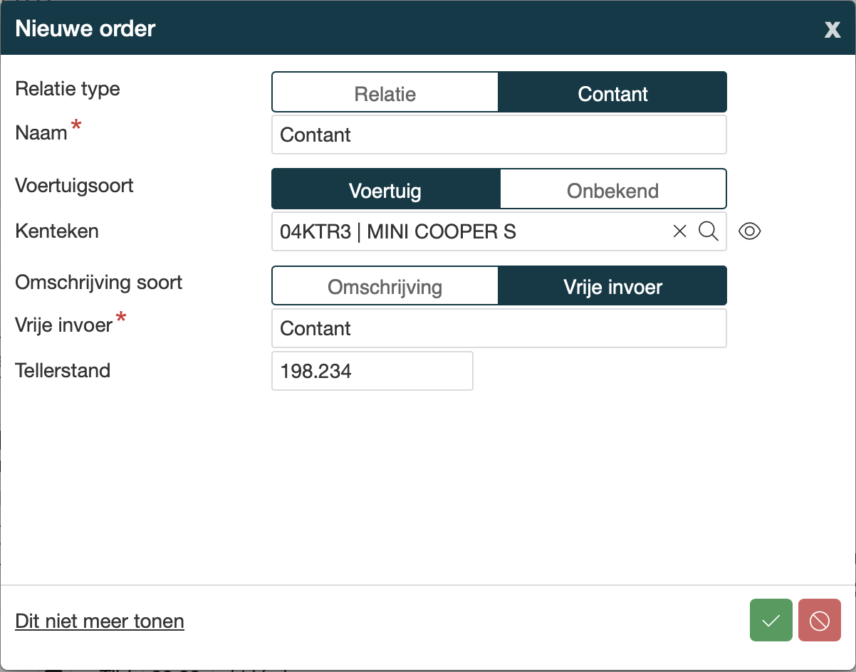 De eerste optie 'Order' geeft de 4 belangrijkste velden voor een order. Na het invullen kun je verder met de werkorder zoals je gewent bent. |