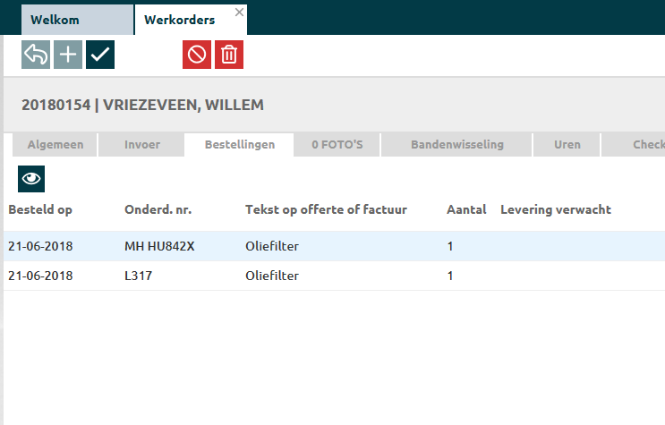 De onderdelen die besteld zijn bij de grossier(s) bij de invoer van de werkorder, staan in het bestelling overzicht getoond. In het overzicht worden ook de retouren getoond.