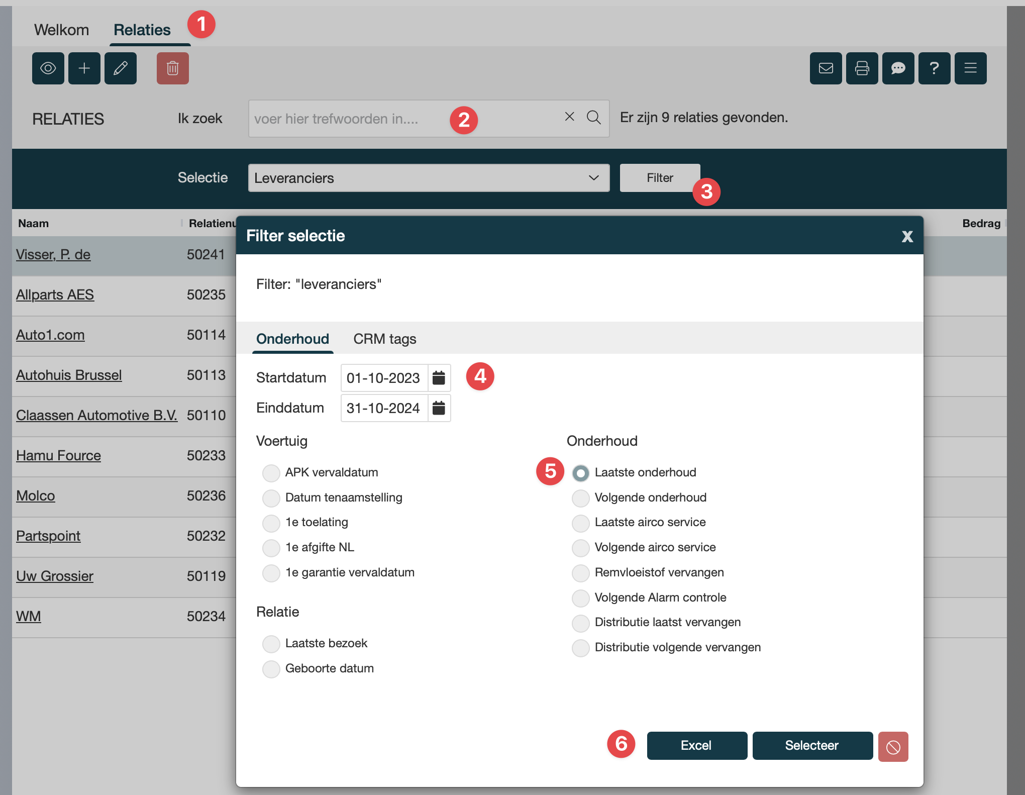 Om een inschatting te krijgen welke olie je moet bestellen kan je in Autoflex een uitdraai maken van de relaties/auto's die het laatste jaar in onderhoud zijn geweest.