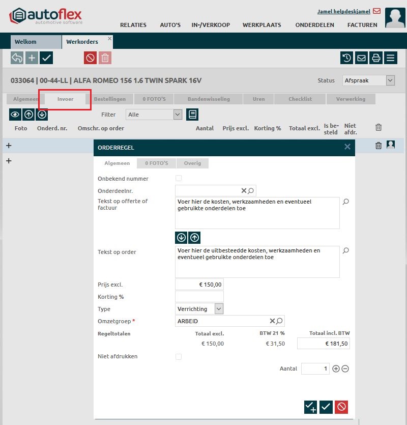 Maak een nieuwe werkorder aan en voer hier in het tabblad "Invoer" in welke werkzaamheden er zijn uitgevoerd en/of welke onderdelen er zijn gebruikt. |