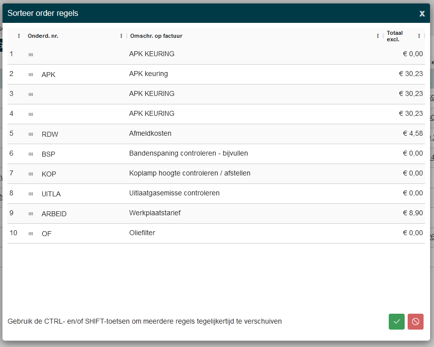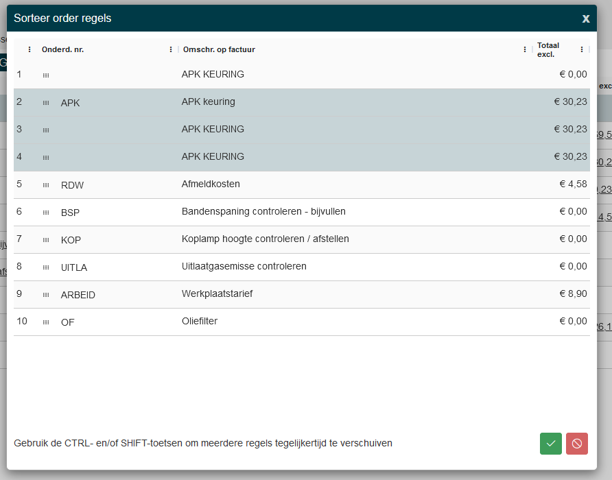 Met CTRL kan je steeds een extra orderregel selecteren. |