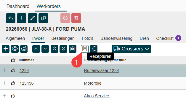 Klik op het icoon wat hieronder in het scherm een rood vierkant heeft, daarin staan recepturen die je kan gebruiken voor in je werkorder. | |