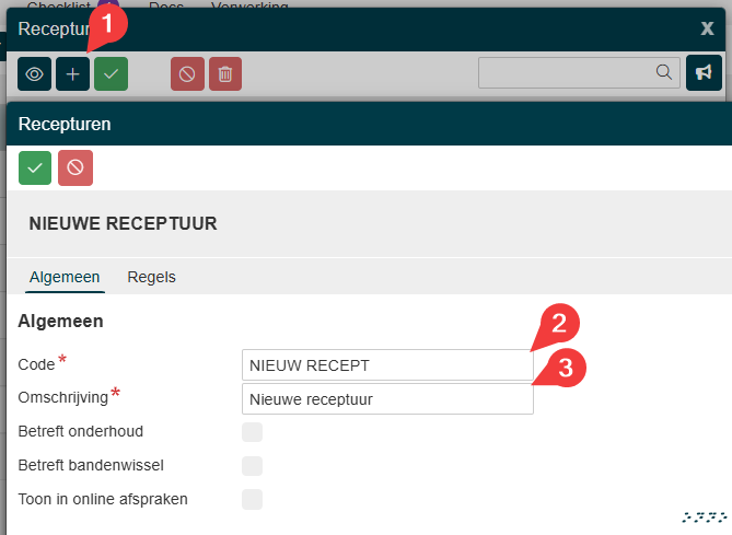 Om een nieuwe receptuur aan te maken, klik op het plusje en daarna krijg je het volgende scherm. | |
