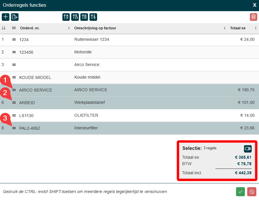 Met CTRL kan je steeds een extra orderregel selecteren. Met het knopje achter “Selectie: 3 regels“ kun je schakelen om het totaal bedrag van de overige regels te bekijken, handig bij het vragen om toestemming! |