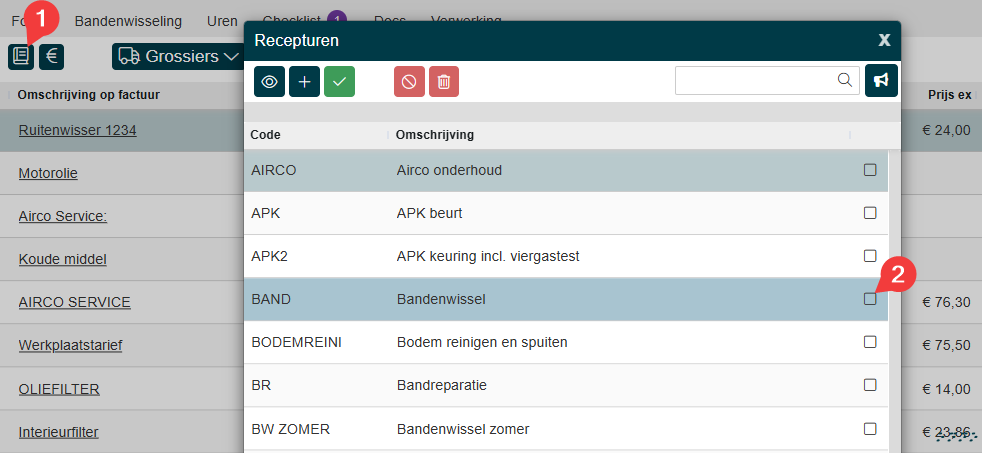 Je krijgt het volgende scherm, je kan ook meerdere recepturen selecteren, klik op het vinkje achter de regel. | |