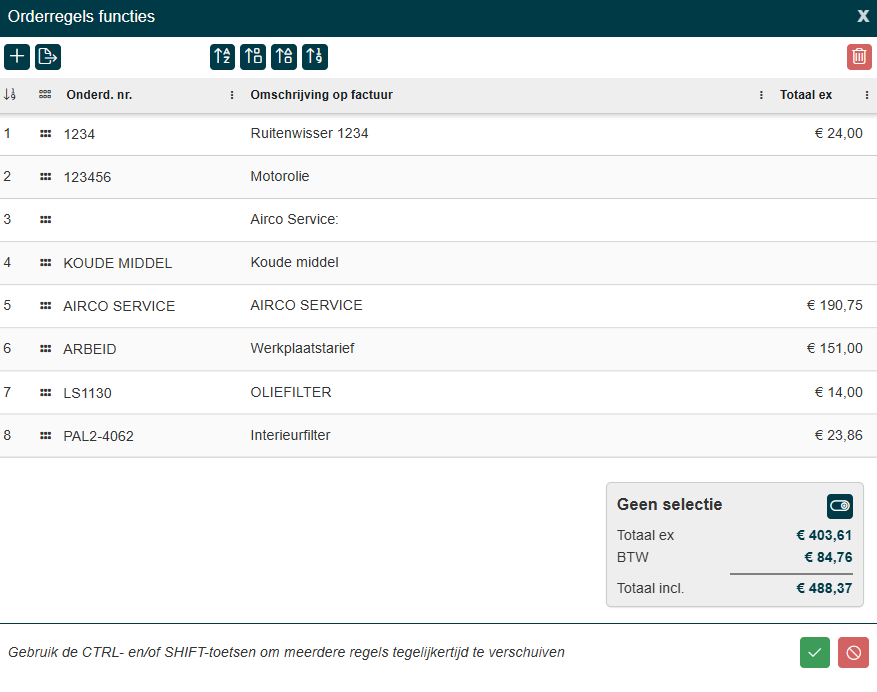 Je kunt de volgorde van de regels wijzigen door op het pijltje naar beneden of boven te klikken of door gebruik te maken van de orderregel functies.