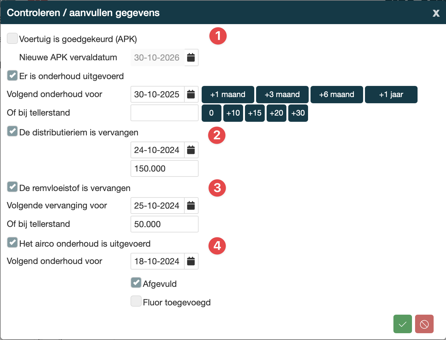 Aanvullende gegevens 1 t/m 4 1 = APK 2 = Distributieriem 3 = Remvloeistof 4 = Airco |