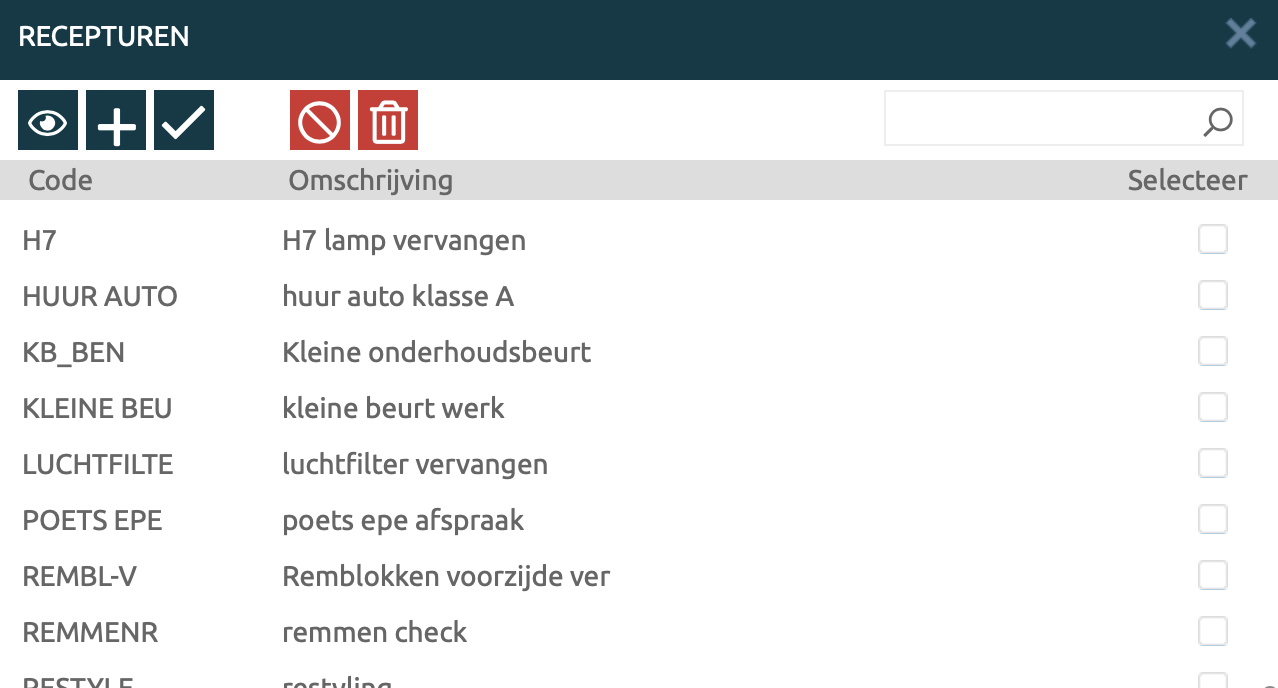 | Om een receptuur te gebruiken vink je het hokje aan onder de kolom Selecteer en met het vinkje komt het receptuur op de order te staan. Je kan één of direct meerdere recepturen selecteren. Met de '+' plus knop kan je een nieuw receptuur aanmaken. |