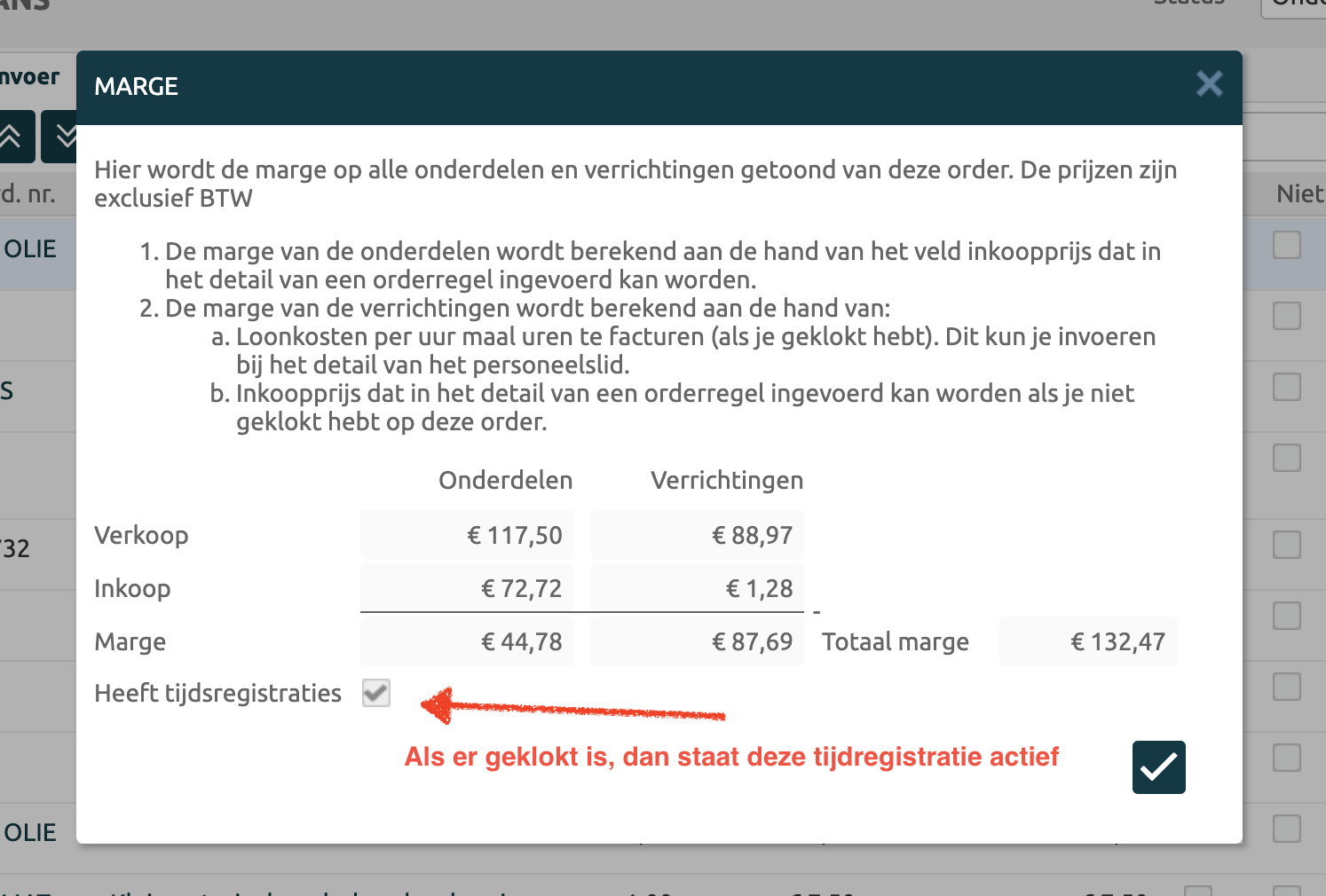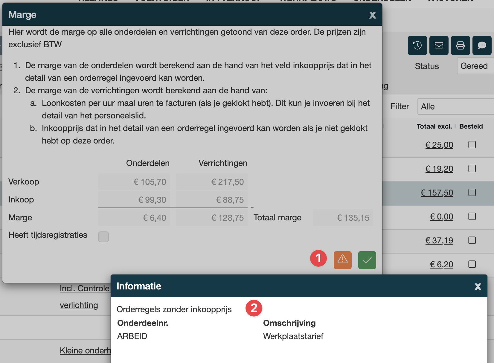 De knop toont een pop-up waarbij over de onderdelen en verrichtingen de marge wordt berekend tussen inkoop en verkoop. Hierdoor zie je wat je op de order verdient als winstmarge. |