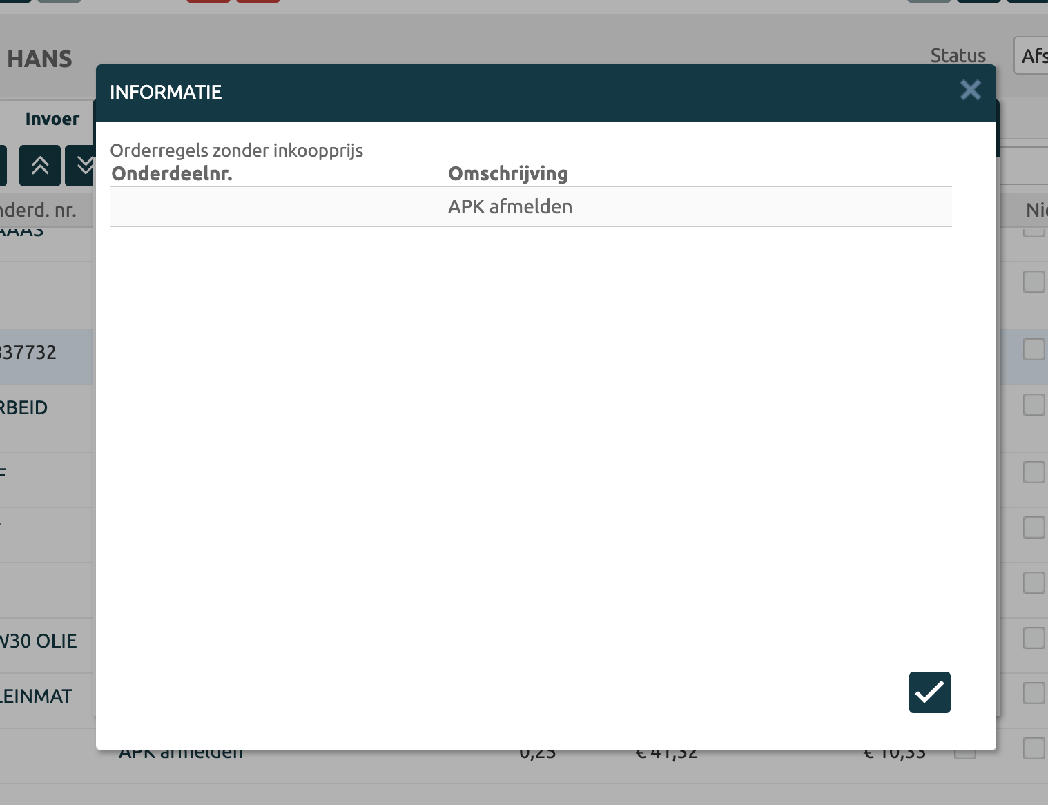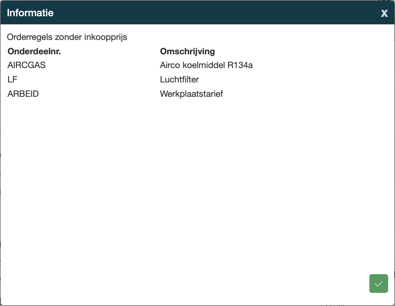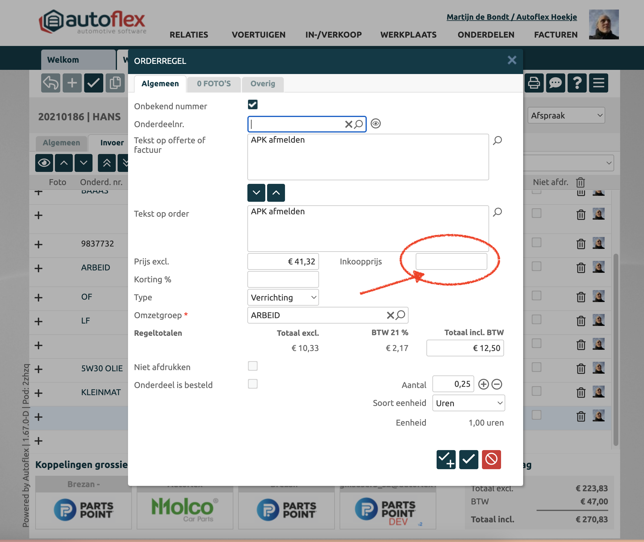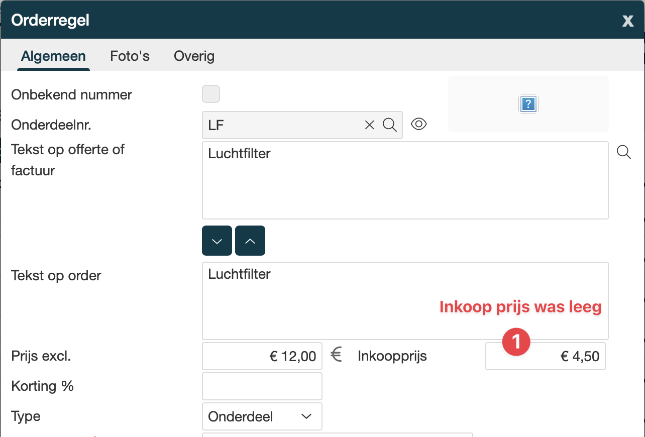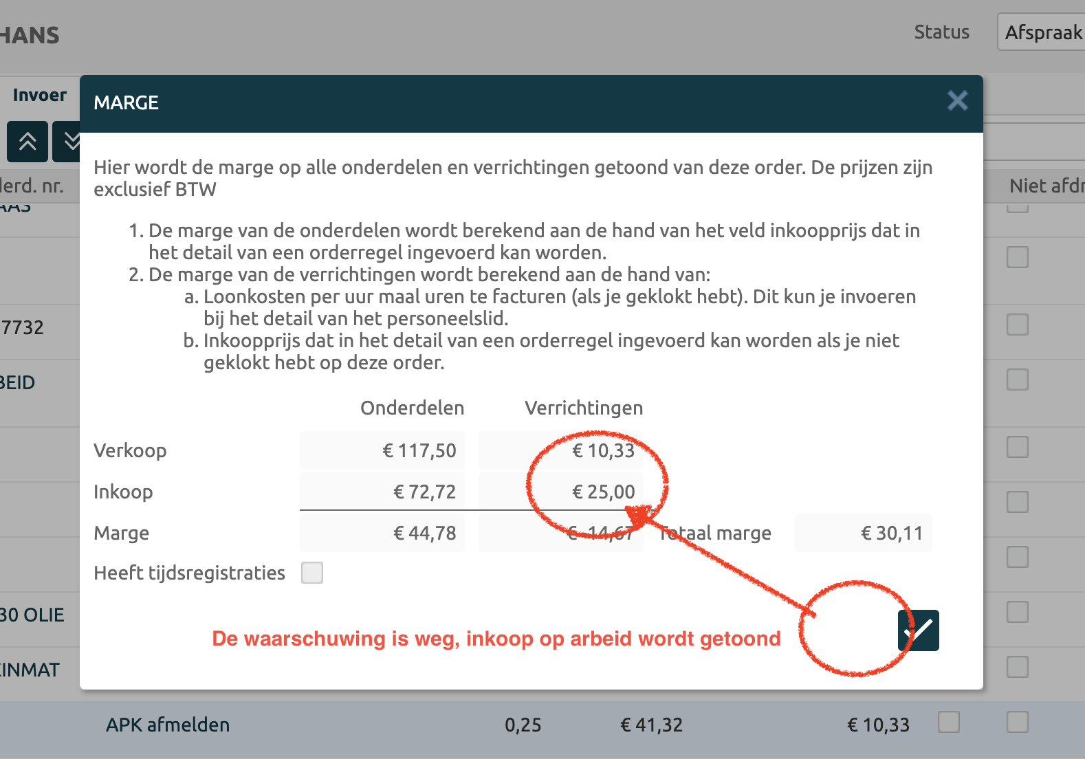 Zodra je het onderdeel opzoekt, de inkoopprijs opvoert, terugkeert naar de werkorder en klikt op de margeknop, dan zul je zien dat de ‘problemen’ voor dit onderdeel zijn opgelost.
