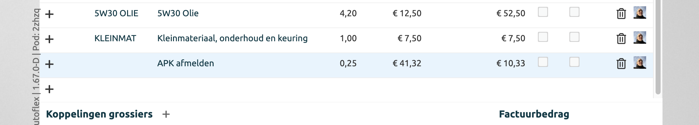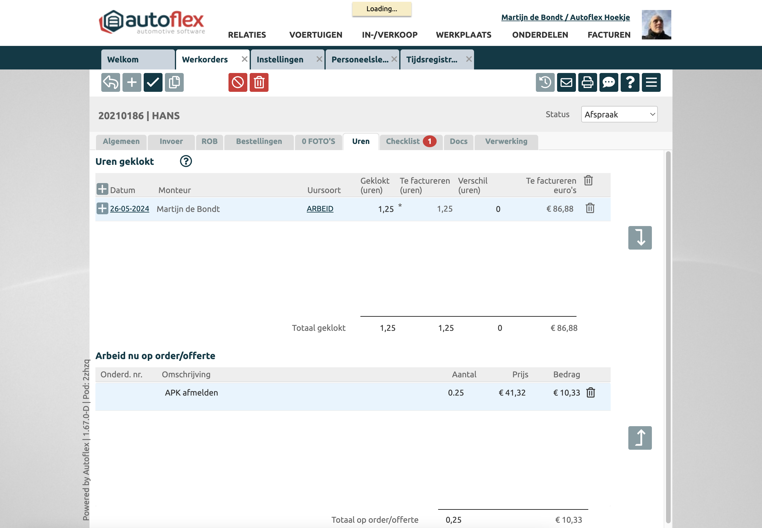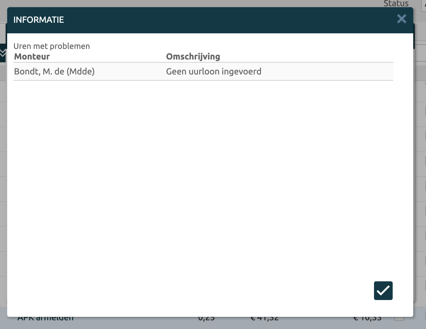 Wanneer je de uren klokt (door klokken in de workflow of door geklokte uren op te voeren), dan zie je de gewerkte uren vermenigvuldigd met het uurtarief, voor het onderdeel APK afmelden