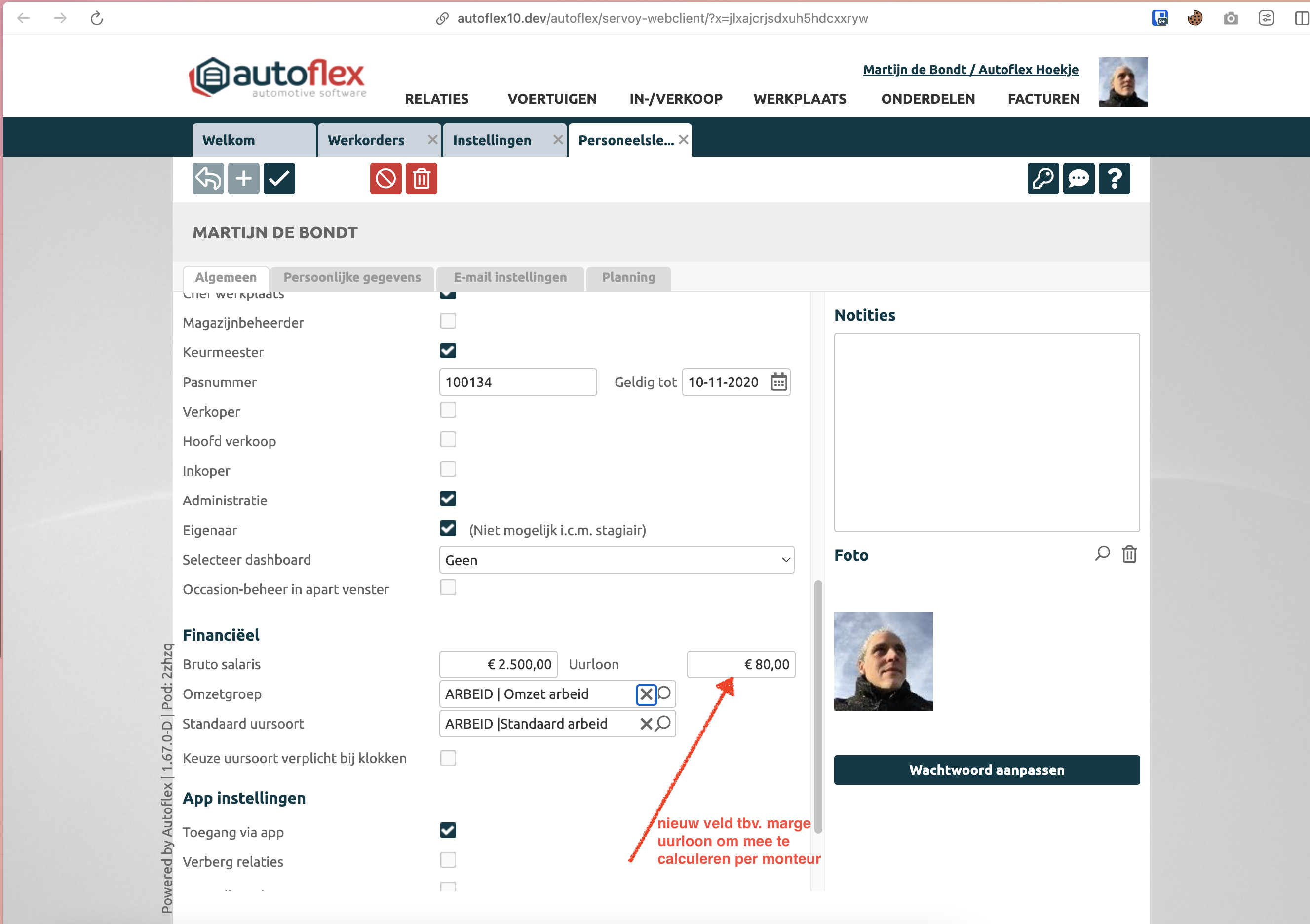 Voor de hoofdrollen in Autoflex is de Winstmarge knop zichtbaar in elke werkorder