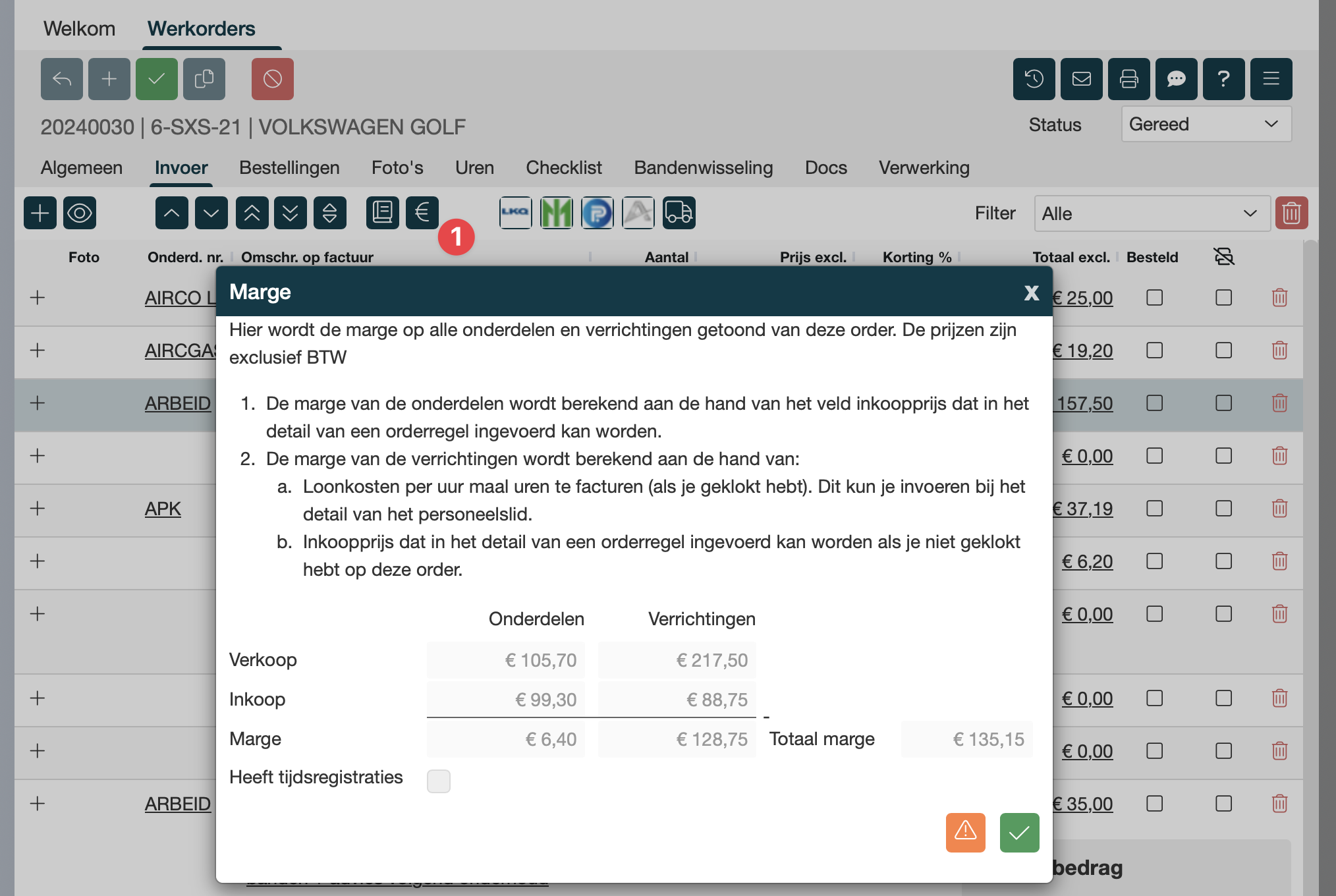 Zodra je het onderdeel opzoekt, de inkoopprijs opvoert, terugkeert naar de werkorder en klikt op de margeknop, dan zul je zien dat de ‘problemen’ voor dit onderdeel zijn opgelost.