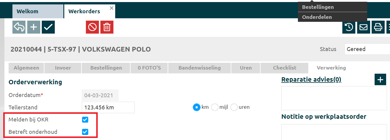Bij de tabblad verwerking kan je aangeven of je tellerstand wil doorgeven aan de RDW. Zet een vinkje aan bij Melden bij OKR, klik hier voor meer informatie.