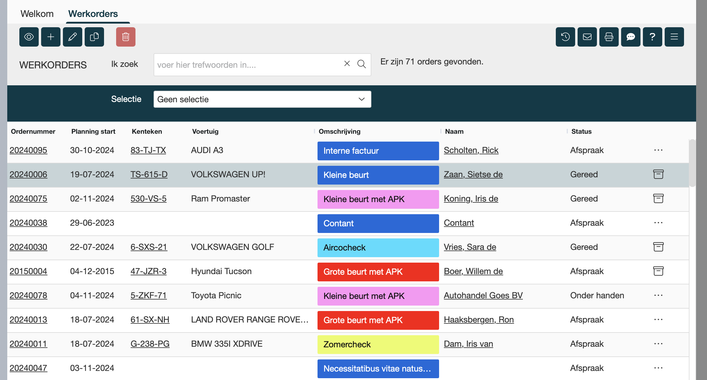 Zoek een werkorder op kenteken, merk, model, relatienaam, werkordernummer of omschrijving