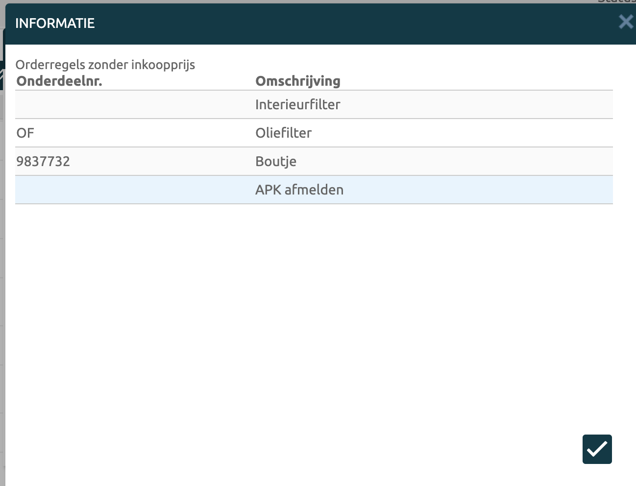 in dit voorbeeld zijn diverse onderdelen zichtbaar zonder inkoopprijs |